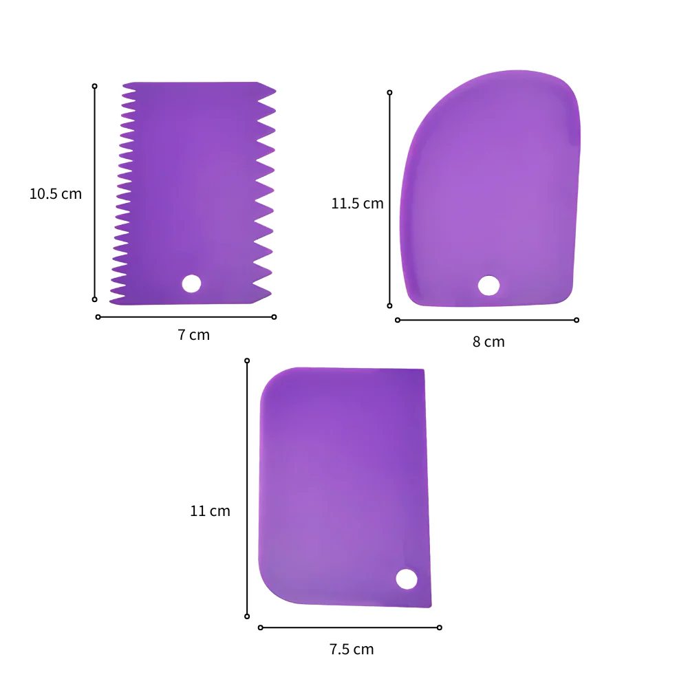 Este kit de 3 alisadores será perfecto para tu kit de repostería, ya que cuenta con diferentes espátulas para diversos acabados en pasteles. Con la espátula recta es perfecta para limpiar residuos y desprender residuos fácilmente. Con la espátula curvada podrás utilizarla como miserable. Y la espátula dentada te ayudará a brindarle textura a tus coberturas de pastel o decorados.