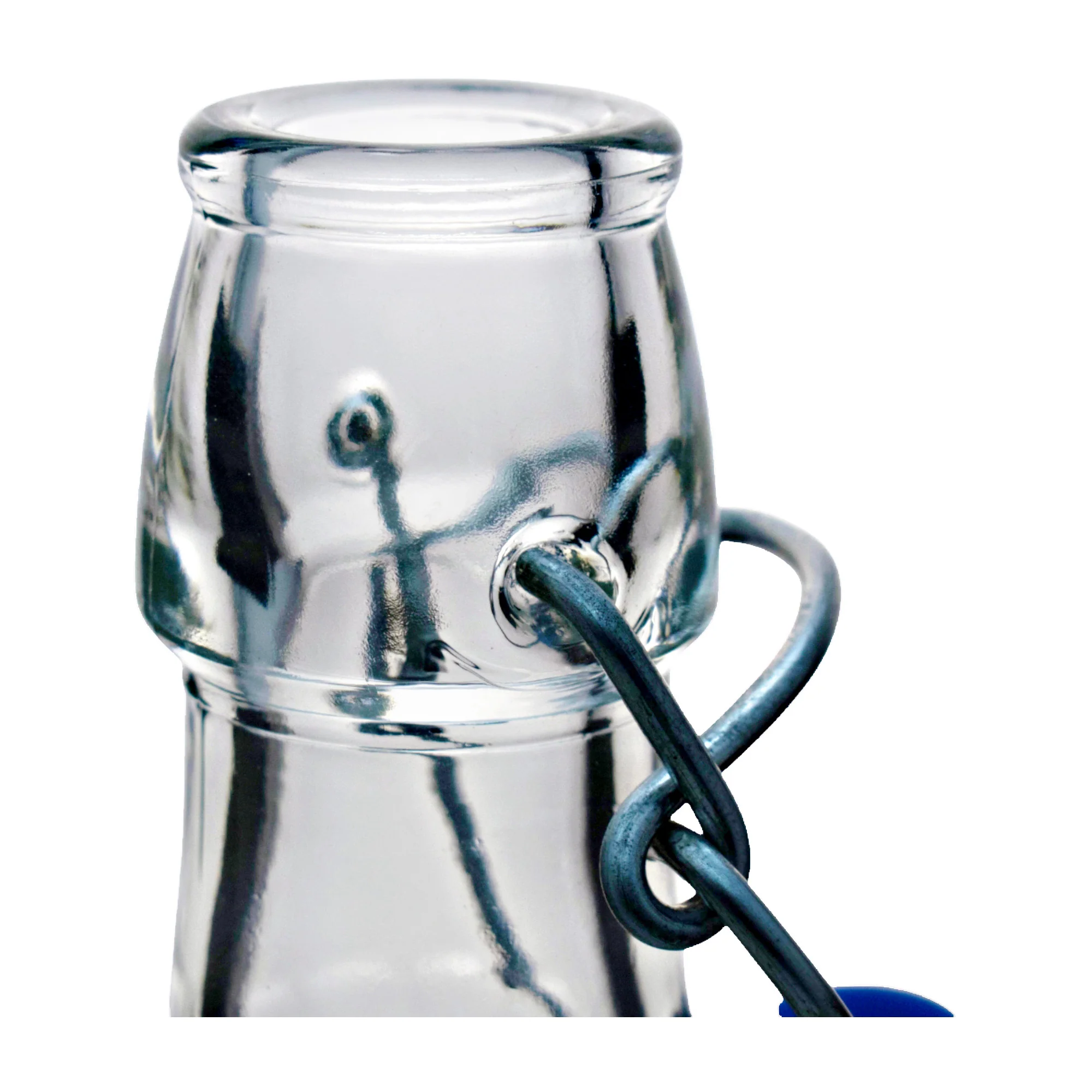 Está fabricada en vidrio transparente de alta calidad, con un diseño clásico y refinado. Su tapón hermético de acero inoxidable y silicona garantiza un cierre seguro que conserva la frescura de las bebidas por más tiempo.