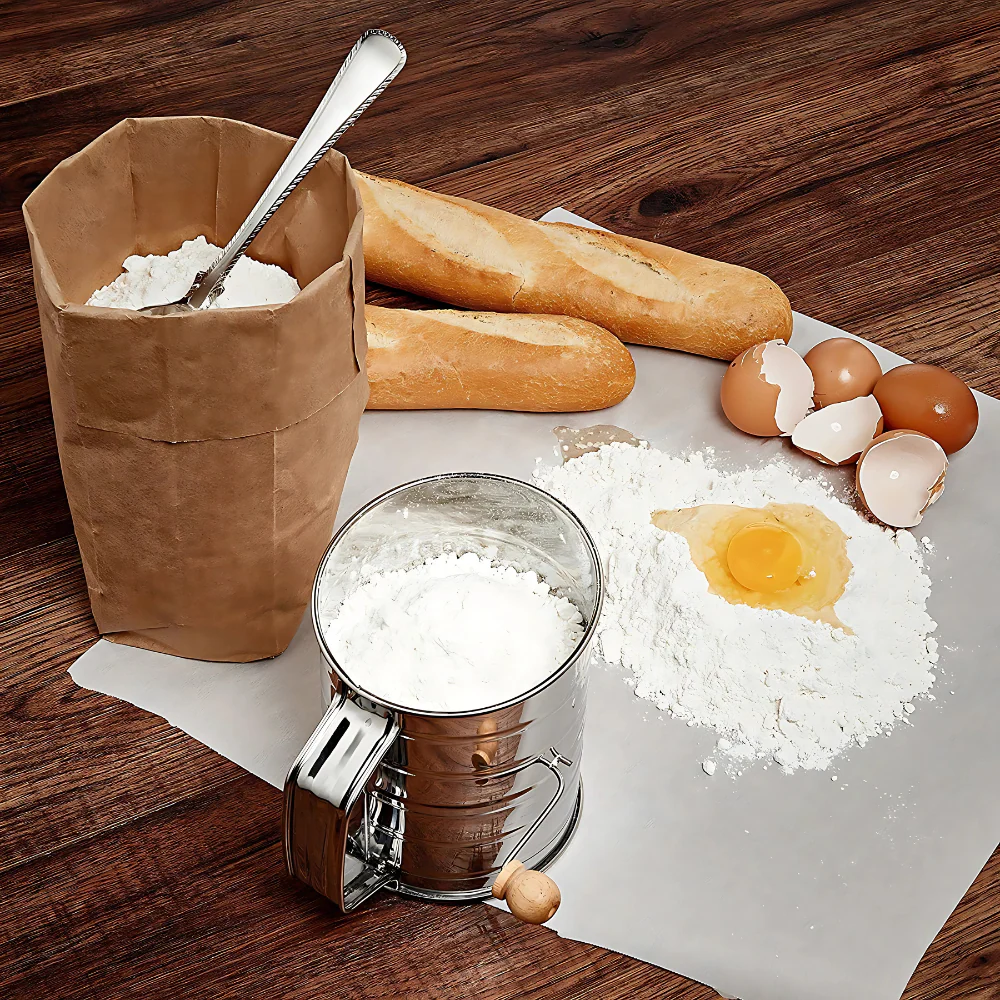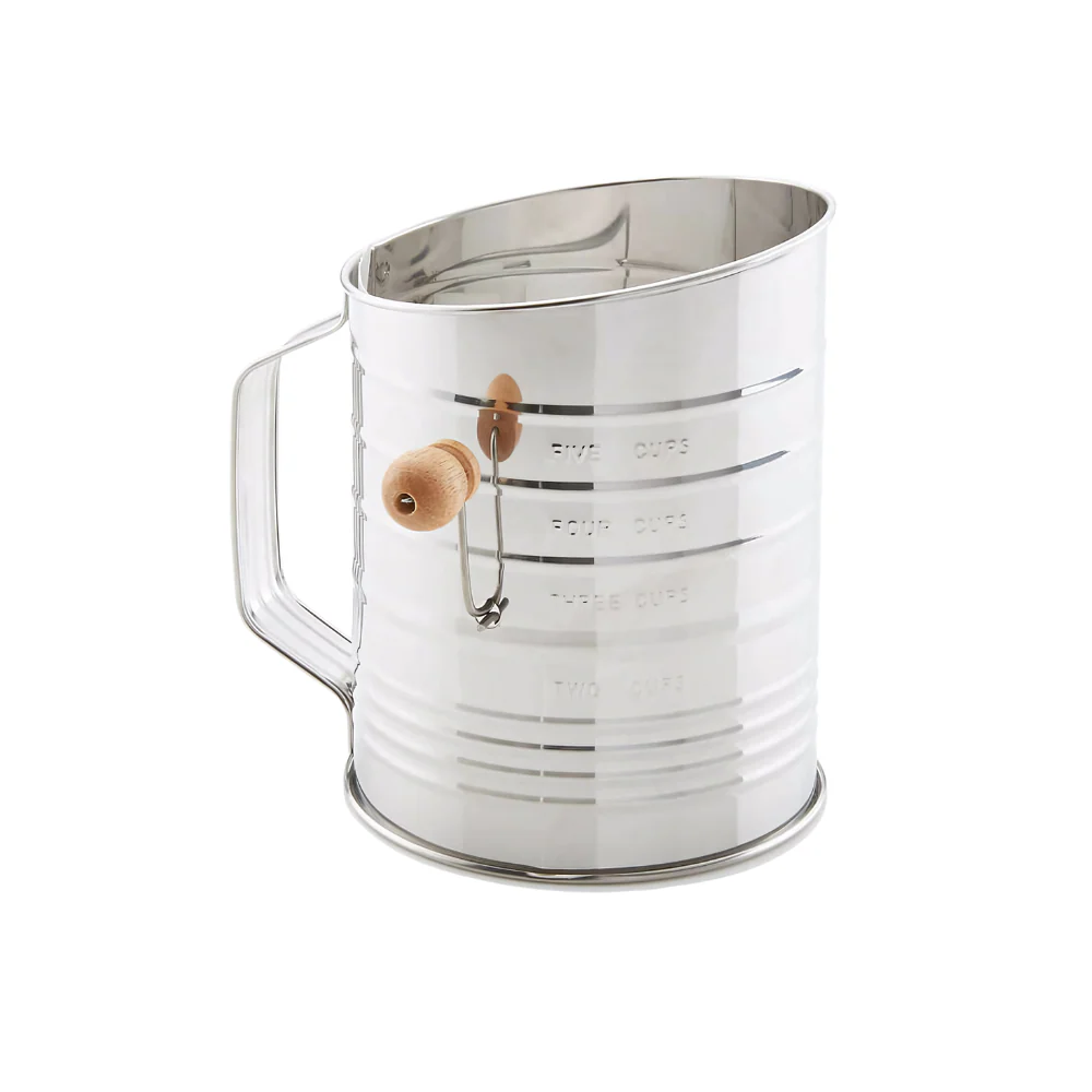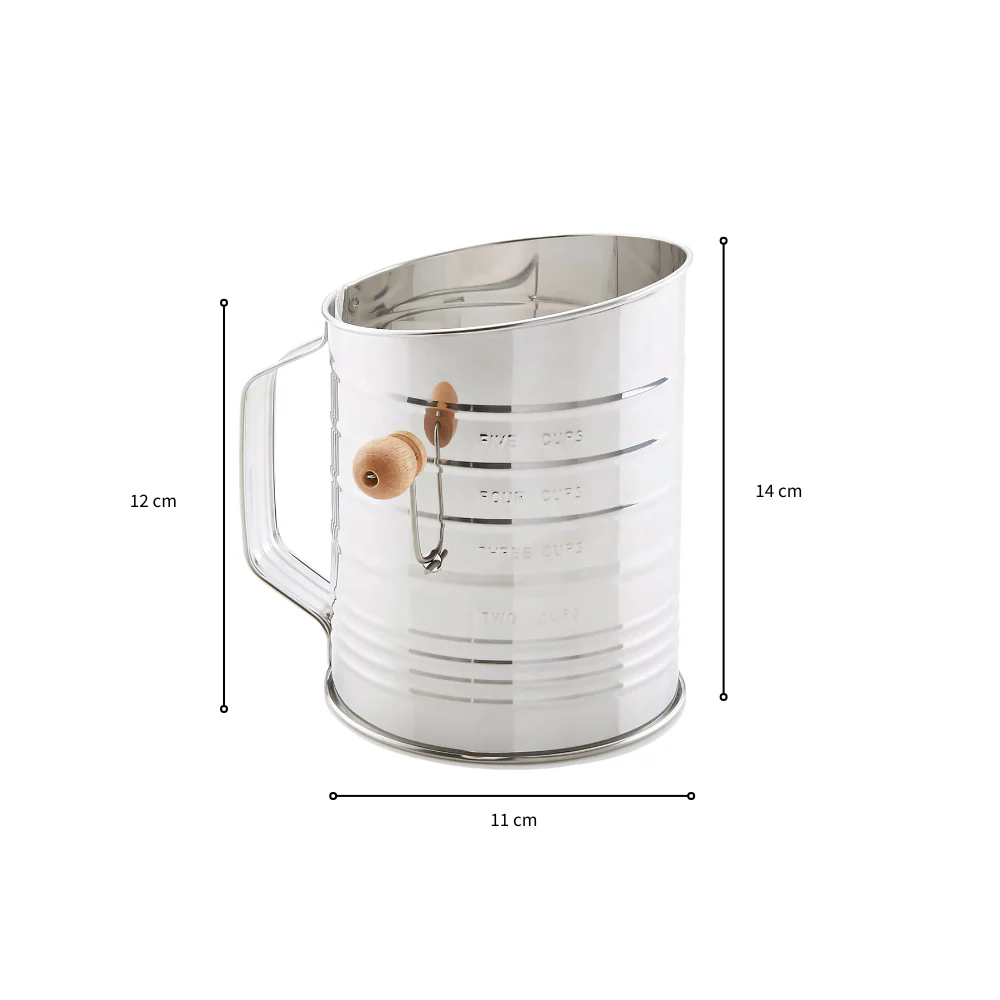 Cernidor o tamiz para repostería fabricado en acero inoxidable con capacidad de 3 tazas o 375 gramos de harina. Este cernidor cuenta con un colador de acero inoxidable y una manija que te ayudará a tamizar tu harina o ingredientes secos de manera sencilla.