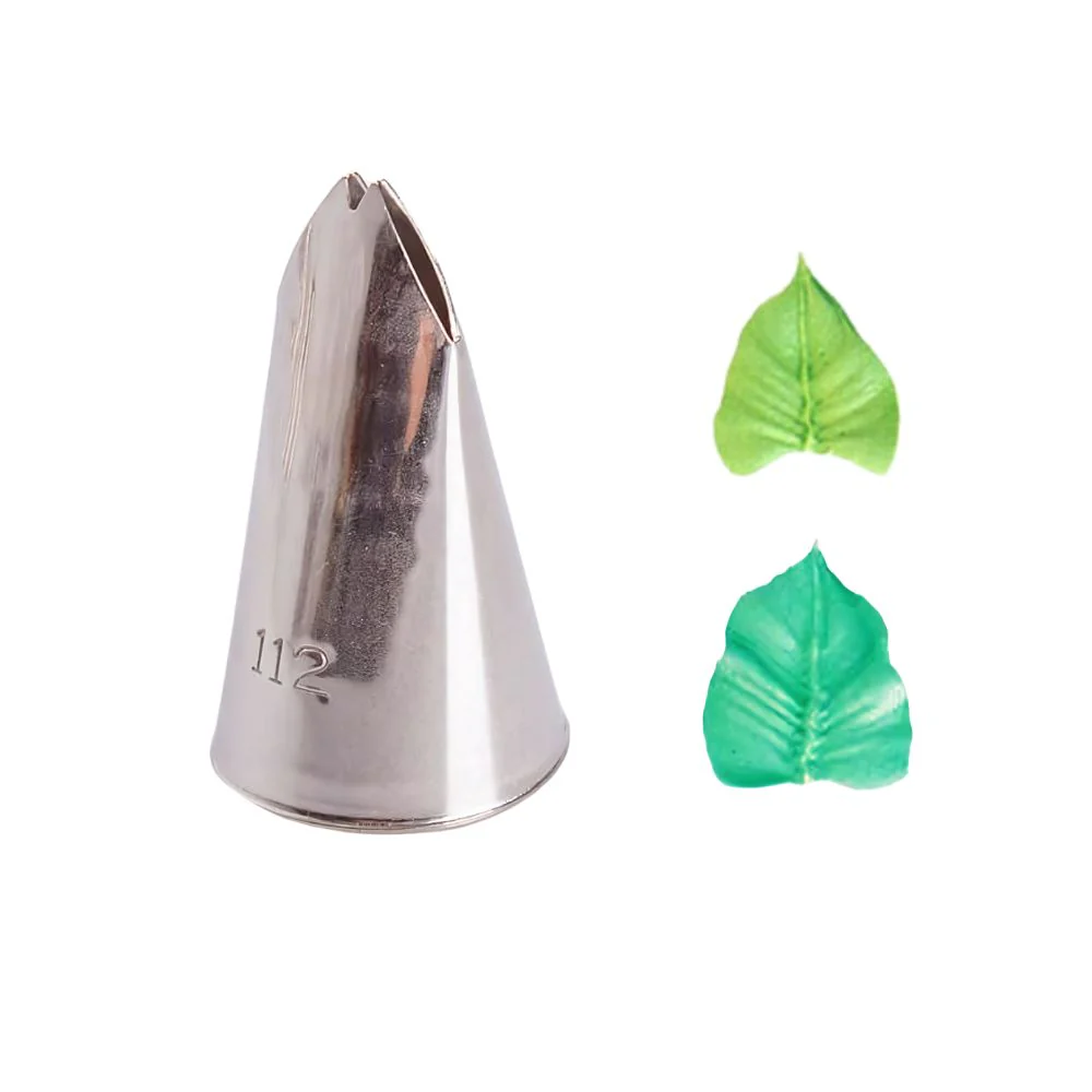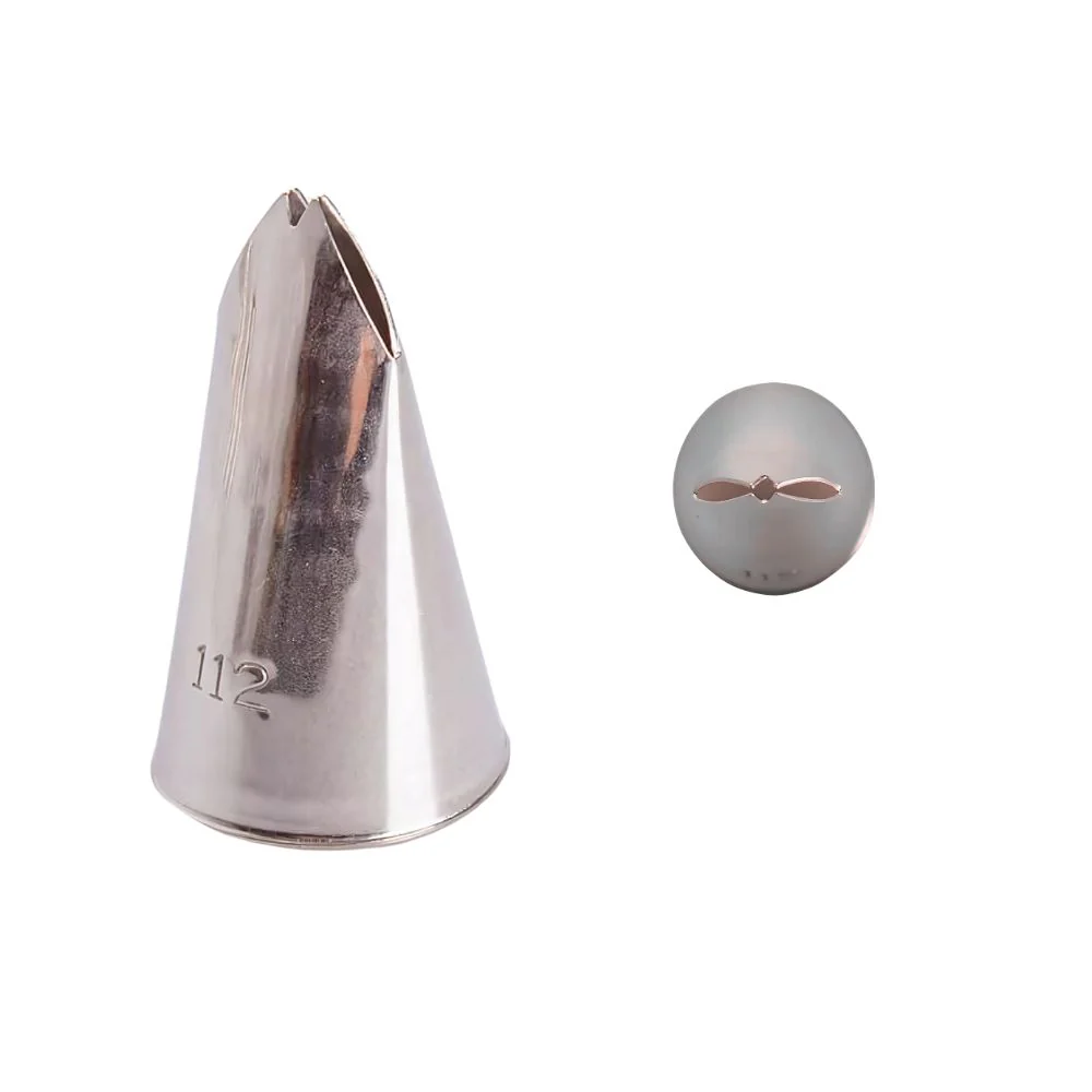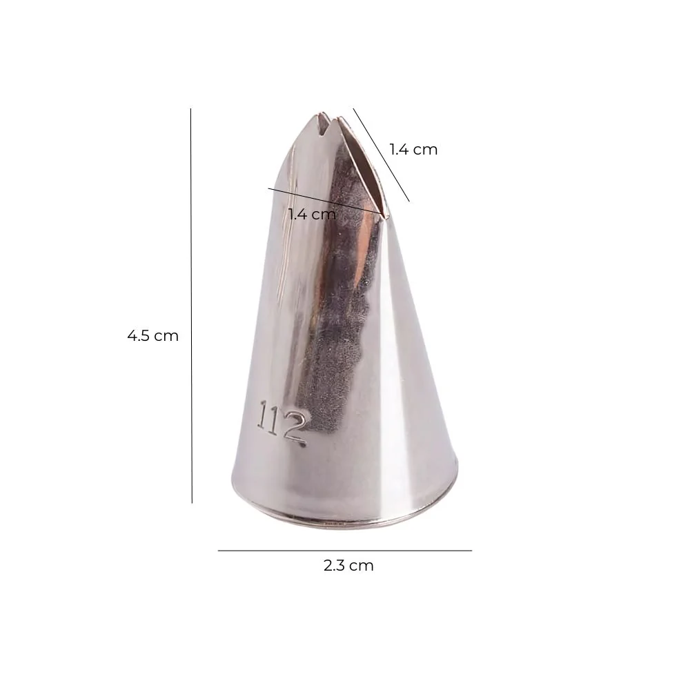 Duya #112 perfecta para hacer pétalos de flores con betún o crema. Esta es la duya perfecta en la decoración de pasteles, gracia a su forma podrás lograr bordes y pétalos definidos. Se usa principalmente para realizar rosas, guirnaldas, volantes o drapeados.