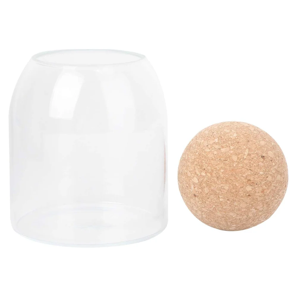 Frasco grueso de vidrio transparente con tapa de corcho esférico.