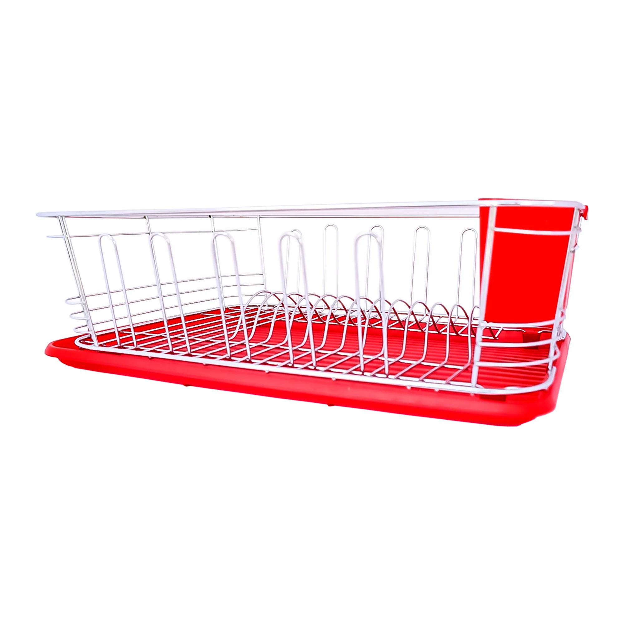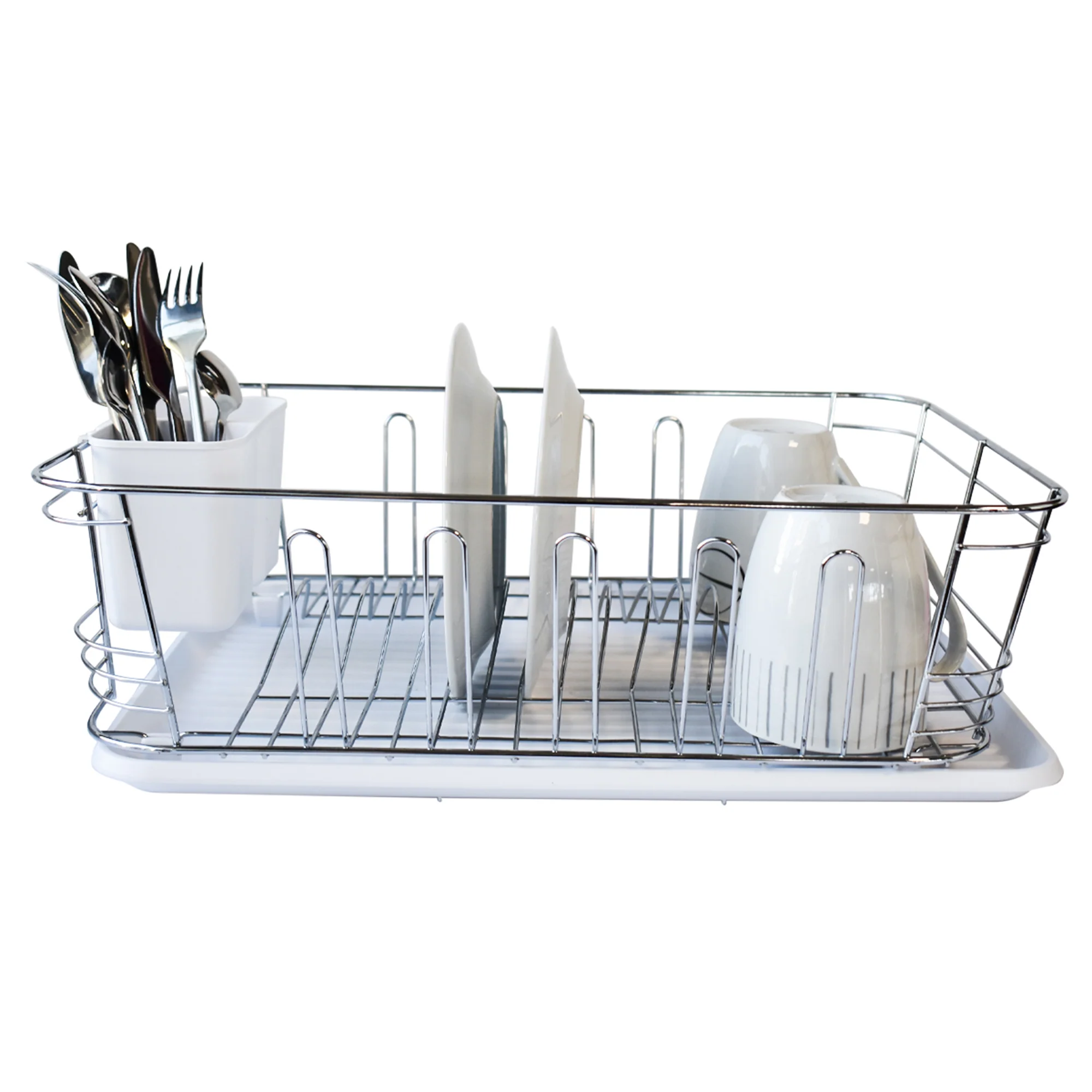 - Incluye 3 piezas: Charola de plástico, reja de acero y escurridor para cubiertos. Adecuado para espacios pequeños, mostrador de cocina y fregadero