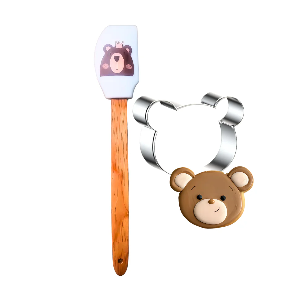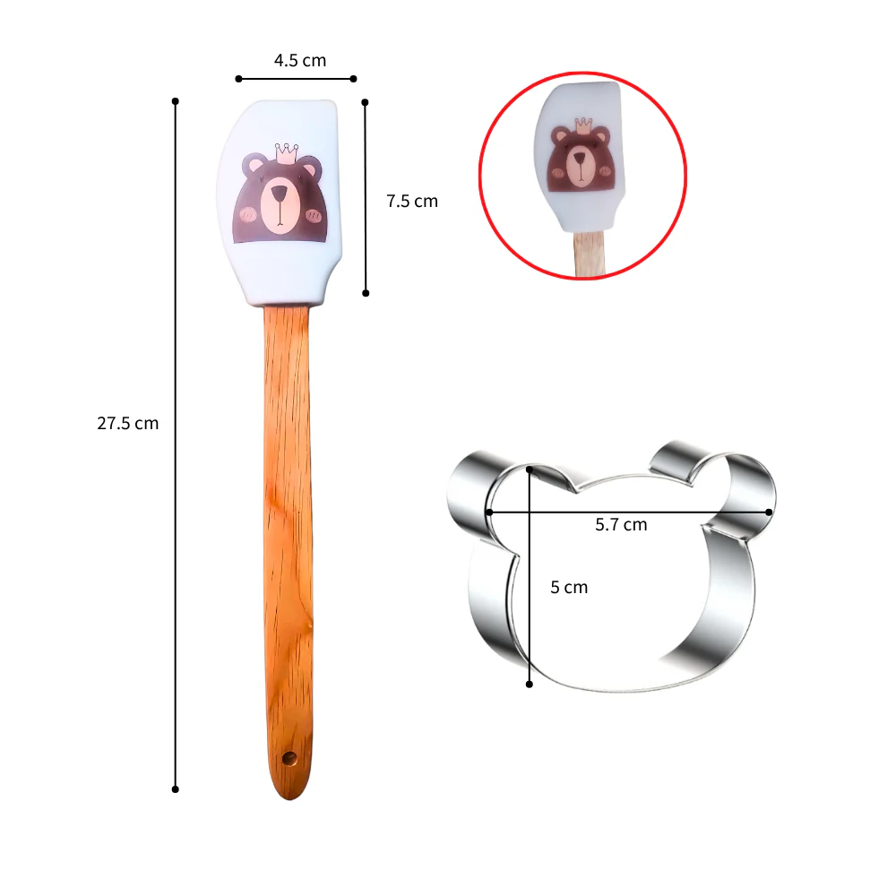 Espátula o miserable con mango de madera y espátula de silicón flexible con diseño de cara de oso. Cortador de lámina en diseño de cara de osito
