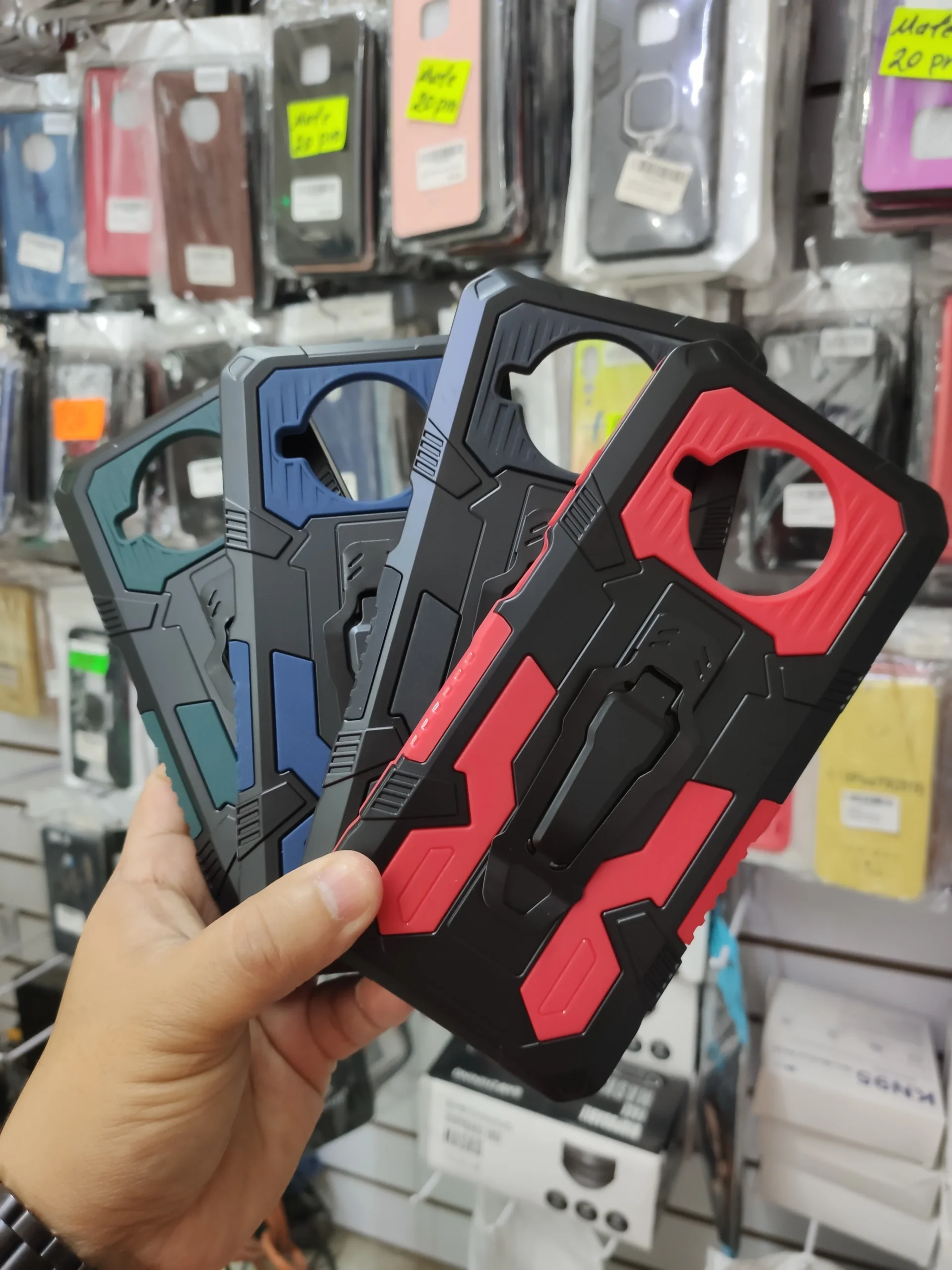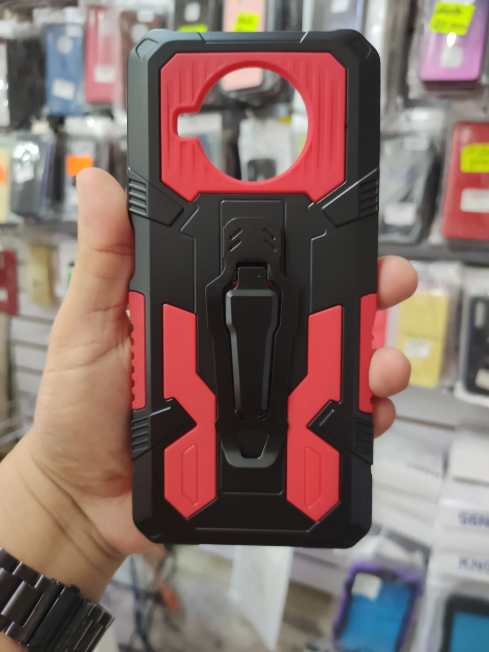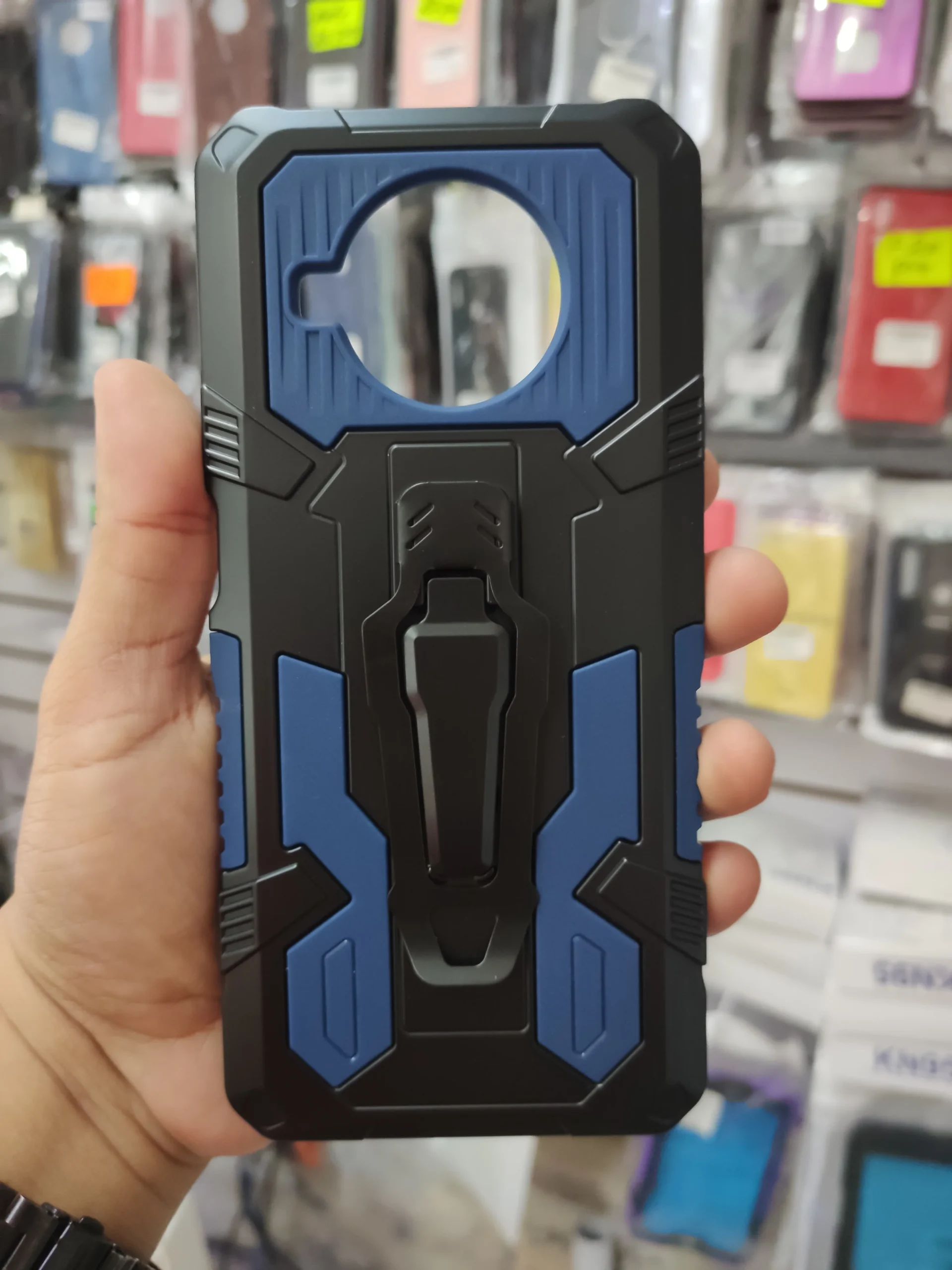 Funda uso rudo con clip que sirve para colgar en el cinturón o para reclinar el celular.