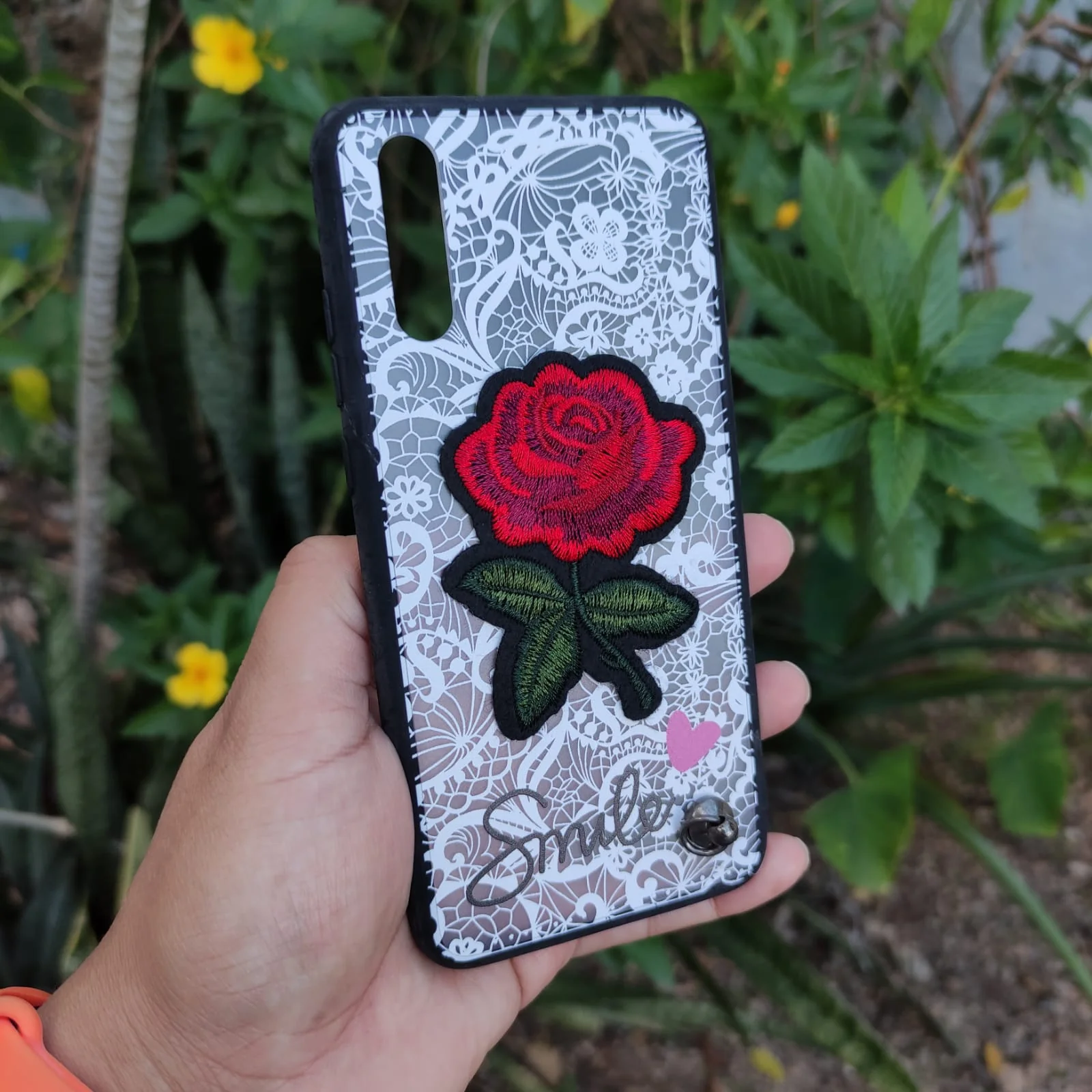 La funda cuenta con una Rosa bordada pegada ala funda.