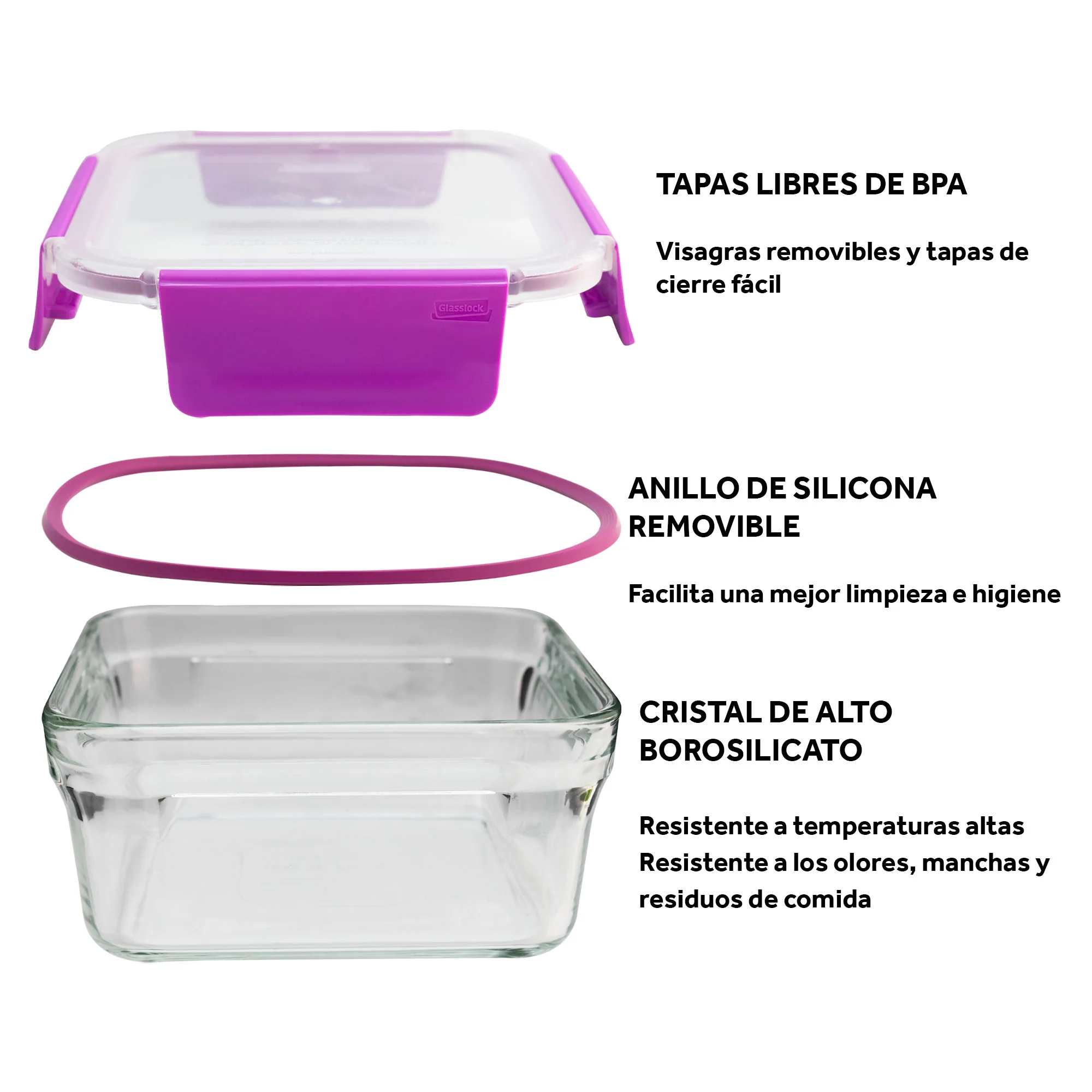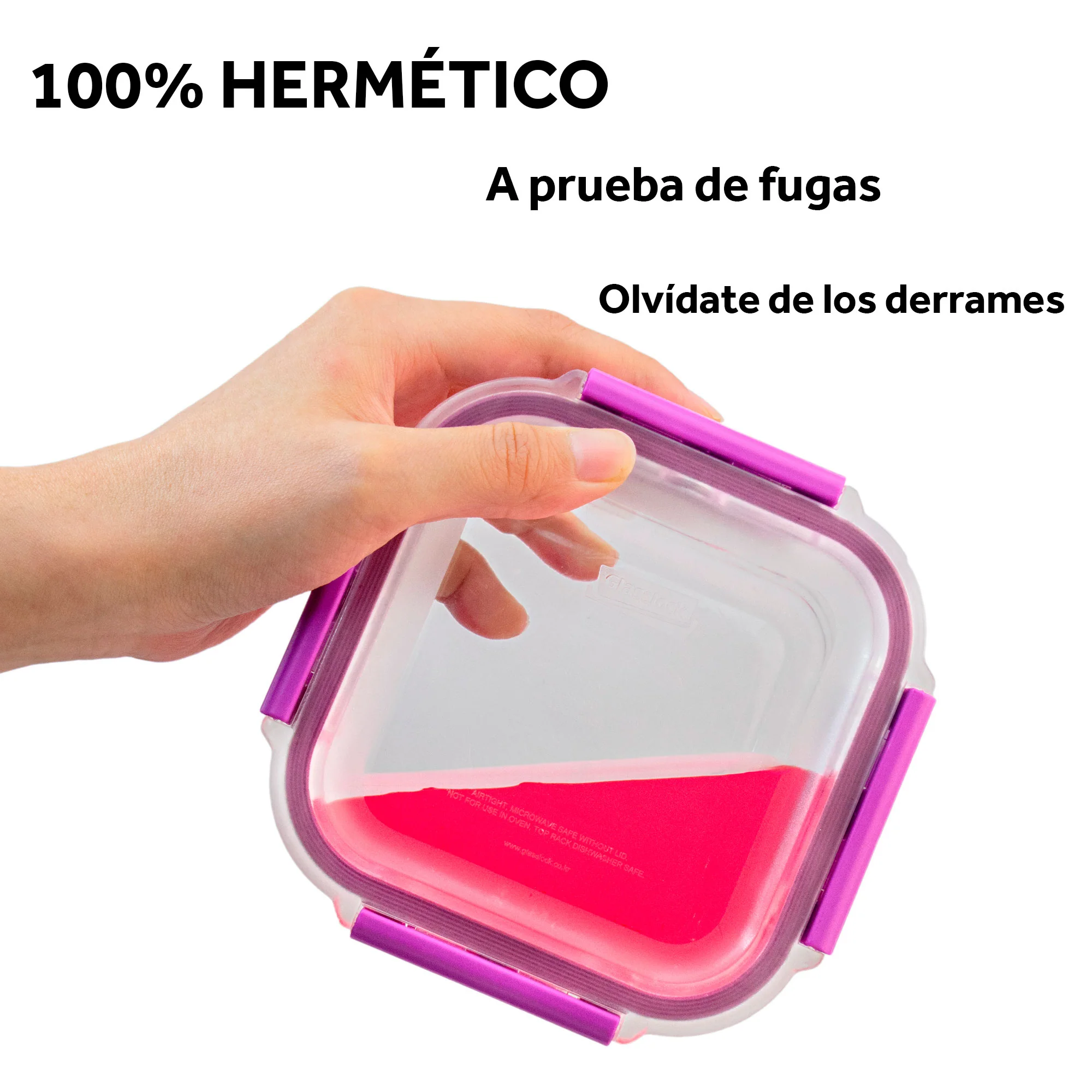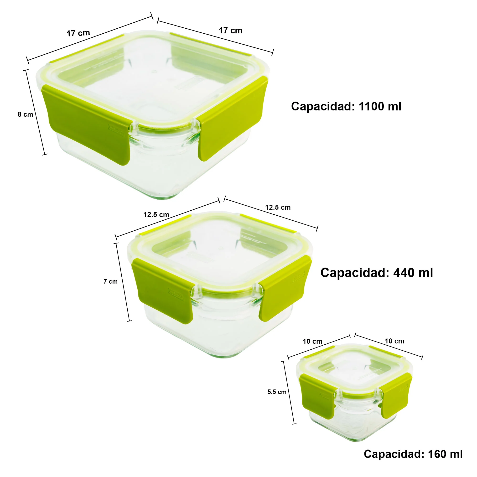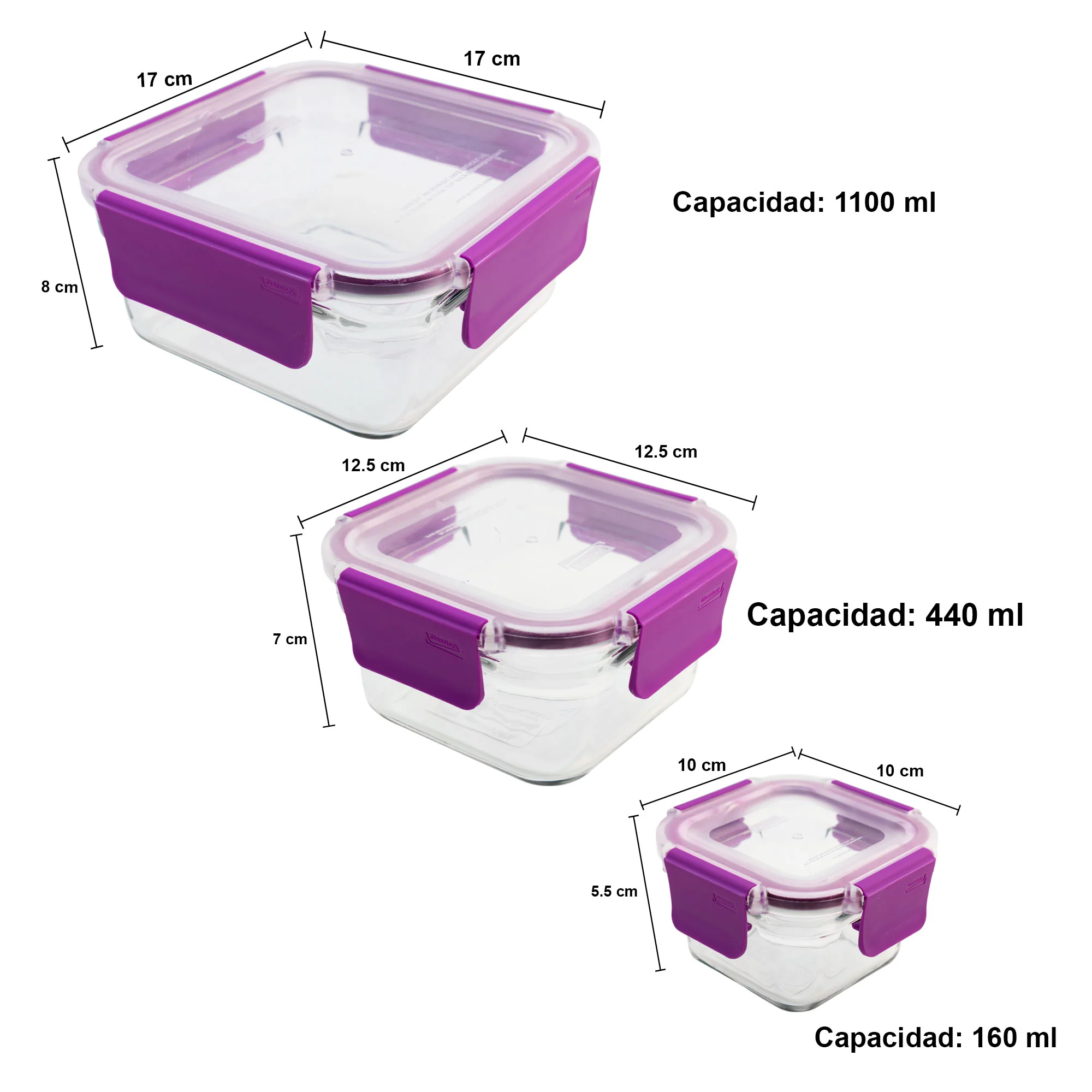 La manera de llevar tu comida o mantener ordenado tu refrigerador con mucha elegancia y estilo, ¡Esta aquí! Con este juego de 3 recipientes de vidrio herméticos rectangulares que puedes elegir entre verde o morado en su tapa, hará que tu día a día será más fácil y tu comida se mantendrá fresca y deliciosa. Estos recipientes vienen con una tapa libre de BPA, en diferentes colores, lo que da seguridad al momento de almacenar alimentos.