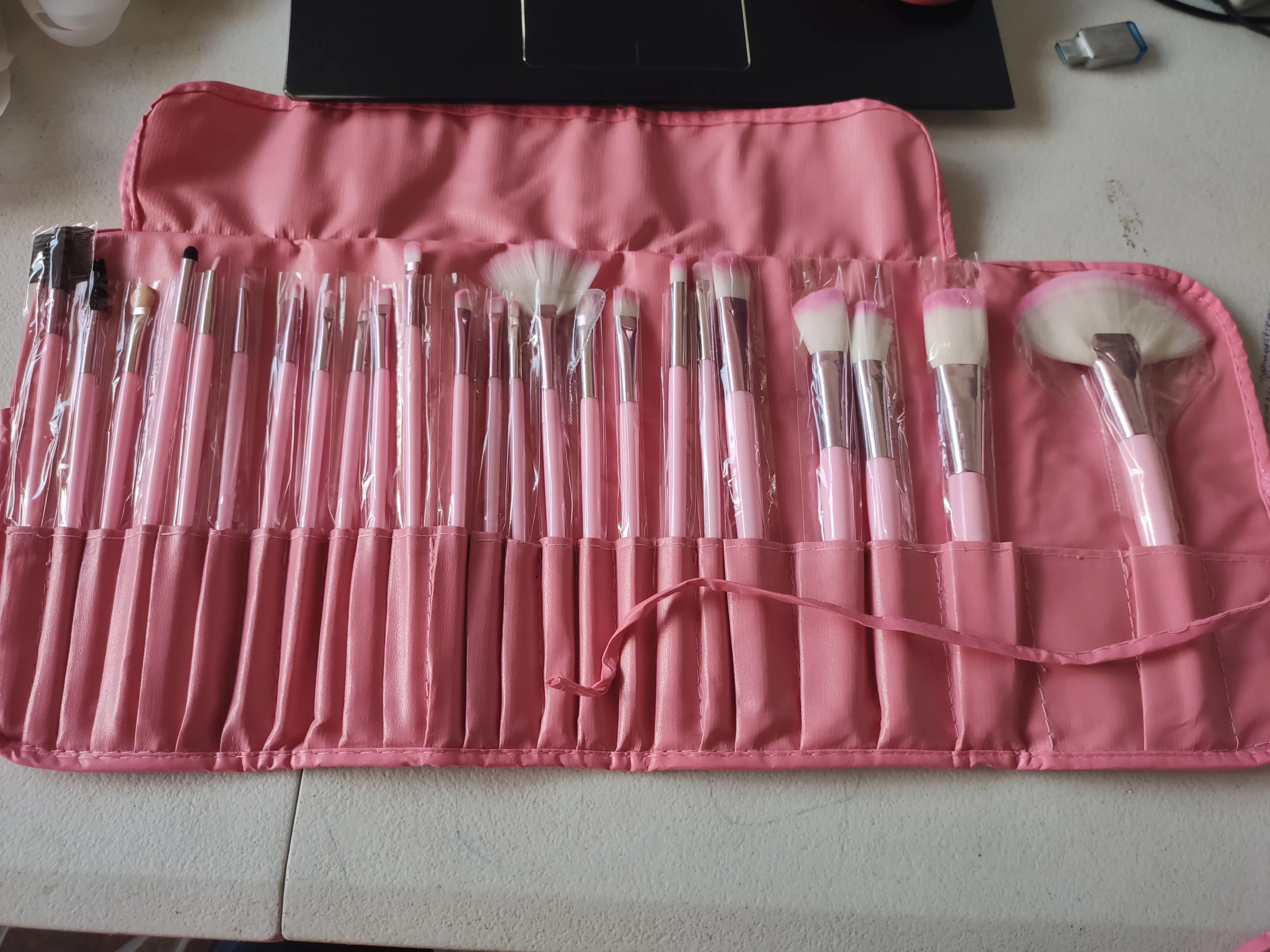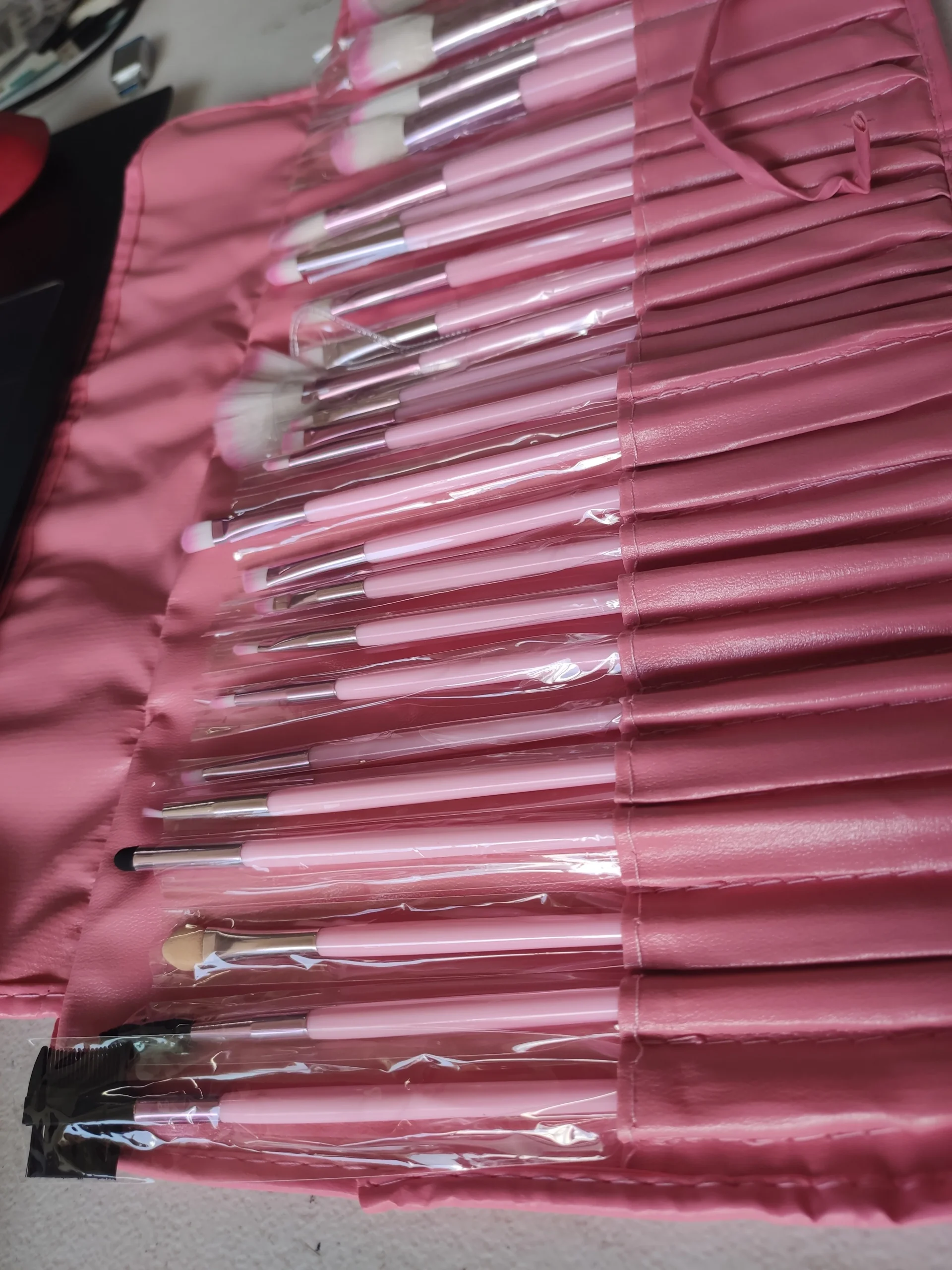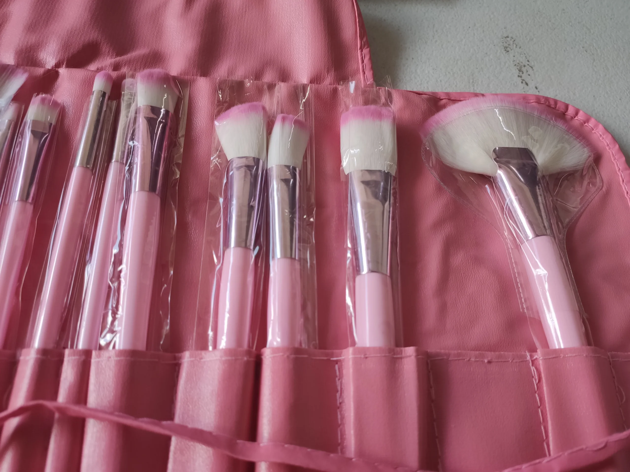 Kit de 24 brochas con su estuche para proteger del polvo, Cerdas suaves y sintéticas, color disponible en rosado.