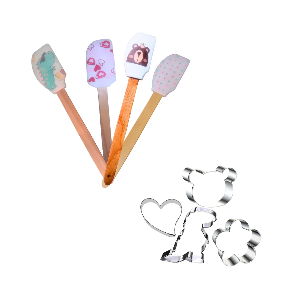 Kit de 8 piezas, cuenta con 4 espátulas de diferentes diseño y 4 cortadores fabricados en lamina.