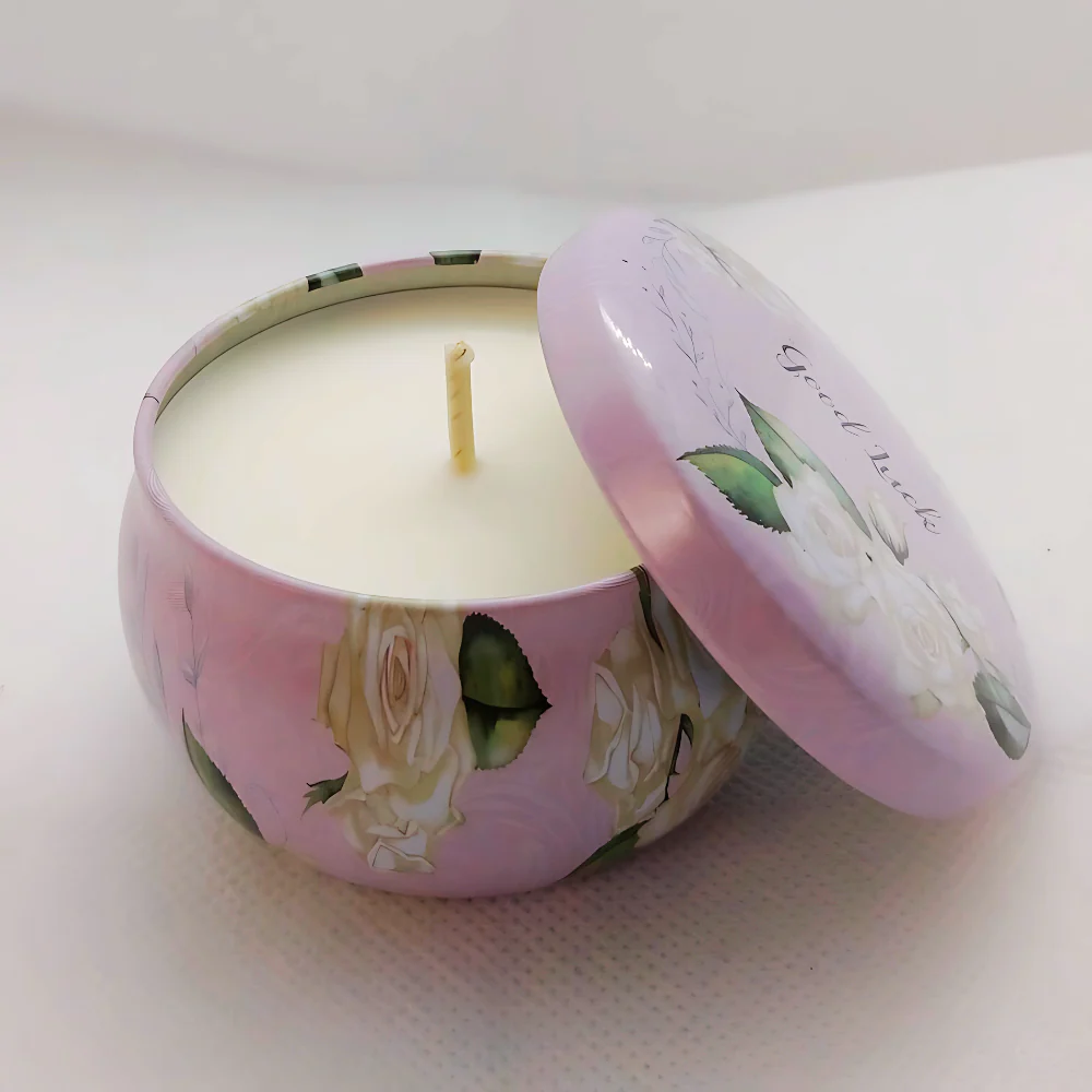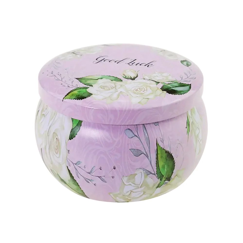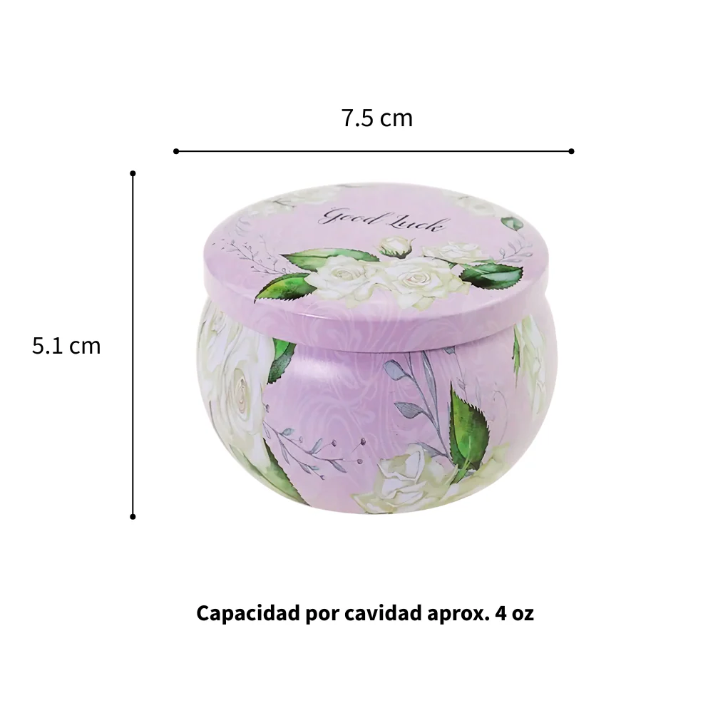 Lata de aluminio con capacidad de 4 oz. Lata con detalles de flores blancas con fondo rosáceo. En la tapa podrás encontrar la frase Good Luck. Lata perfecta para algún recuerdo o regalo.
