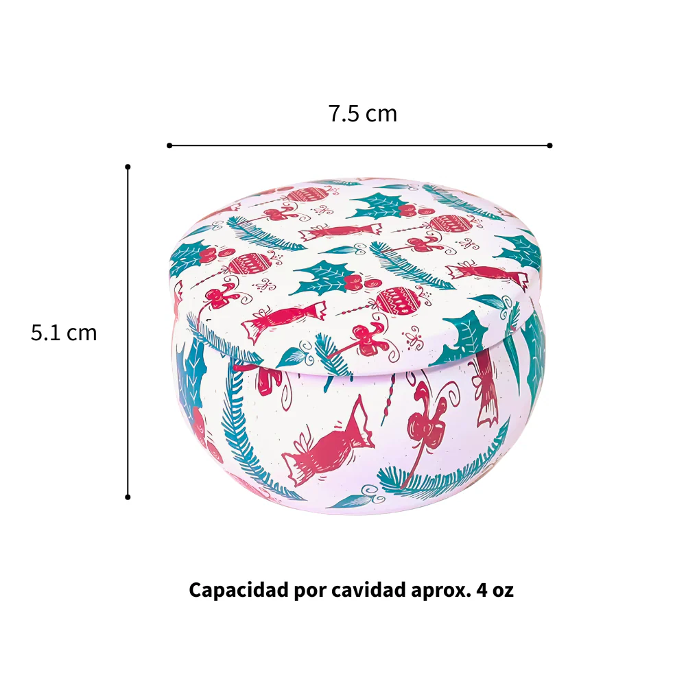 Lata de aluminio con capacidad de 4 oz. Lata de Navidad. Lata de aluminio con fondo blanco y detalles navideños verdes y rojos, muy a tiempo para la temporada.
