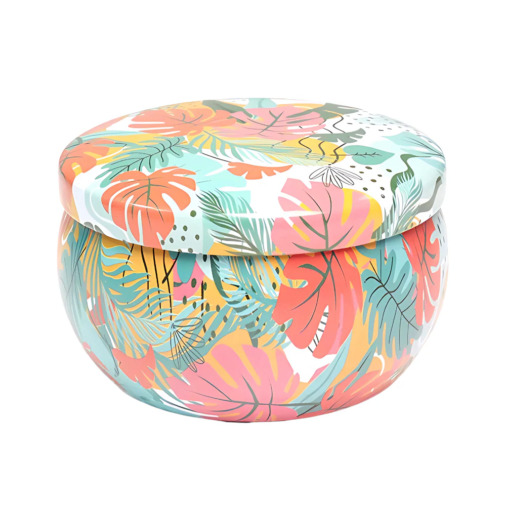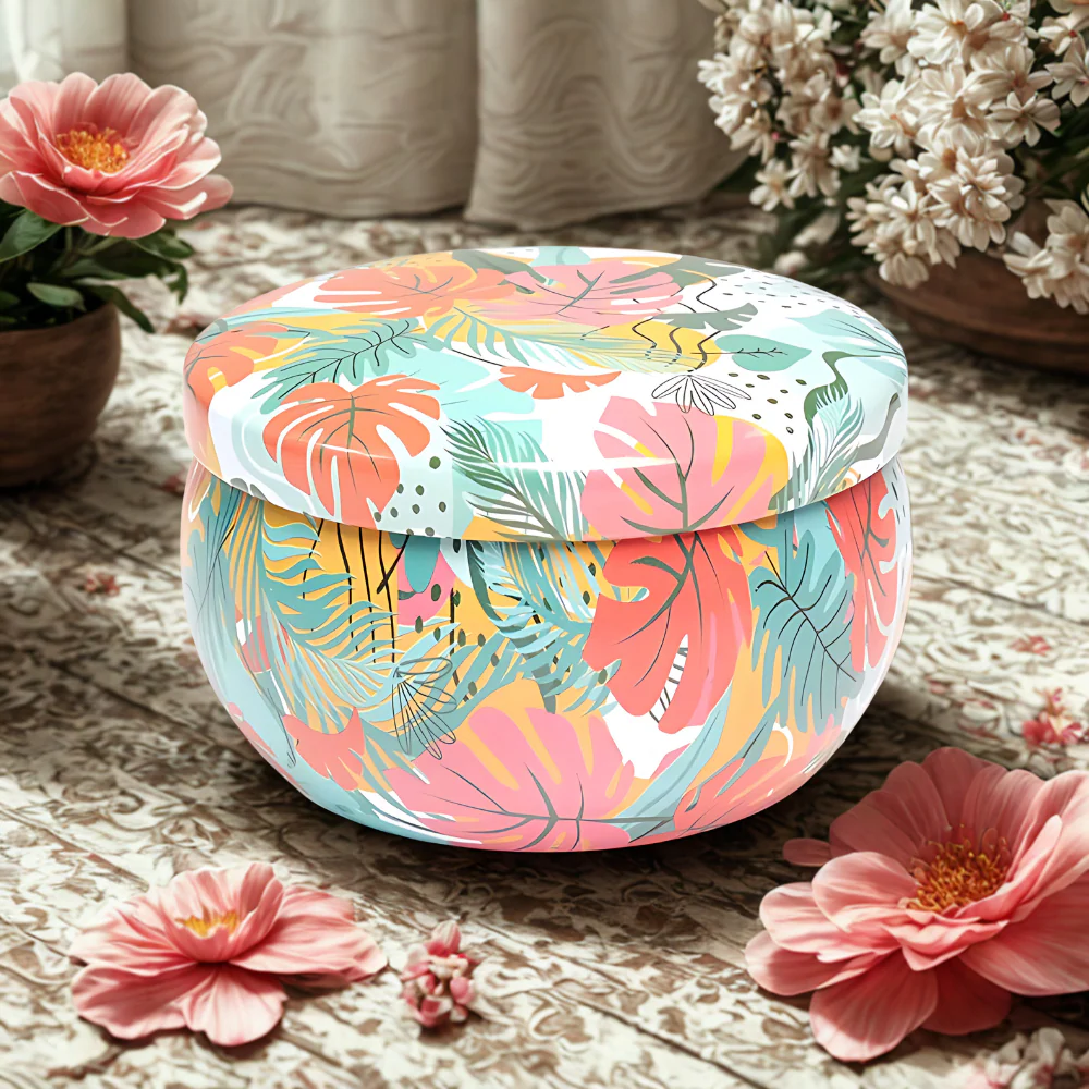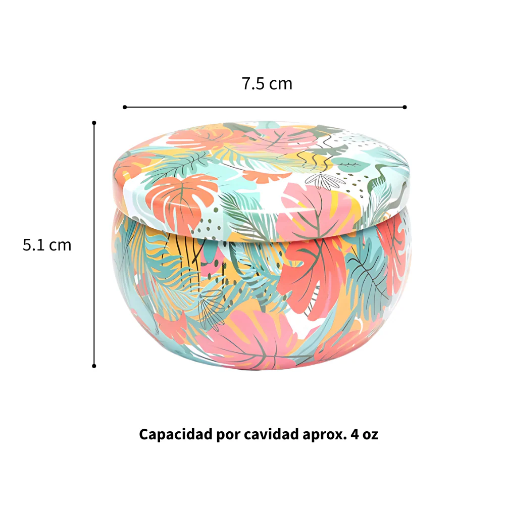 Lata de aluminio con capacidad de 4 oz. Lata con detalles veraniegos, con sus detalles florales de monstera y helechos con tonalidades naranjas y verdes que te harán sentir en la playa.
