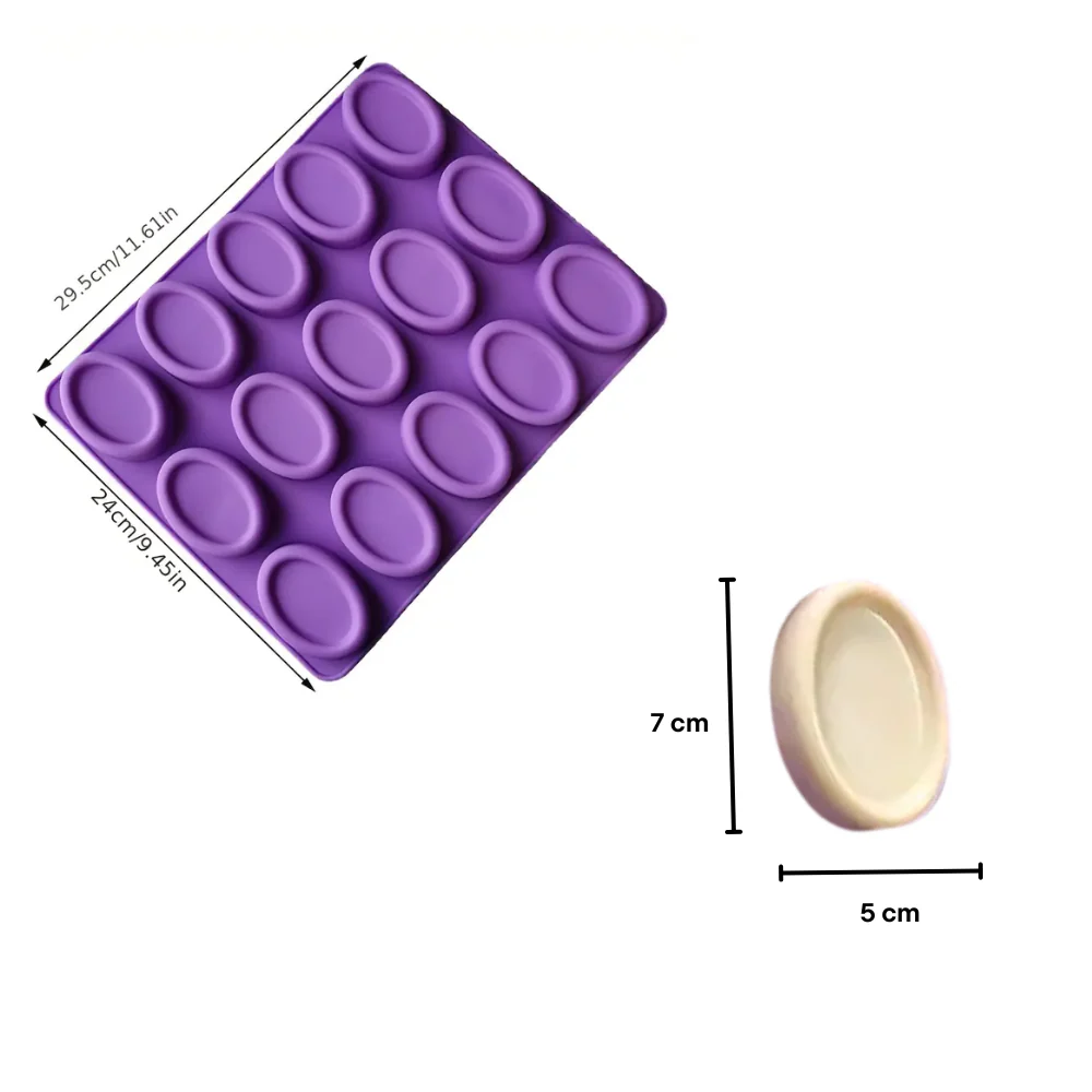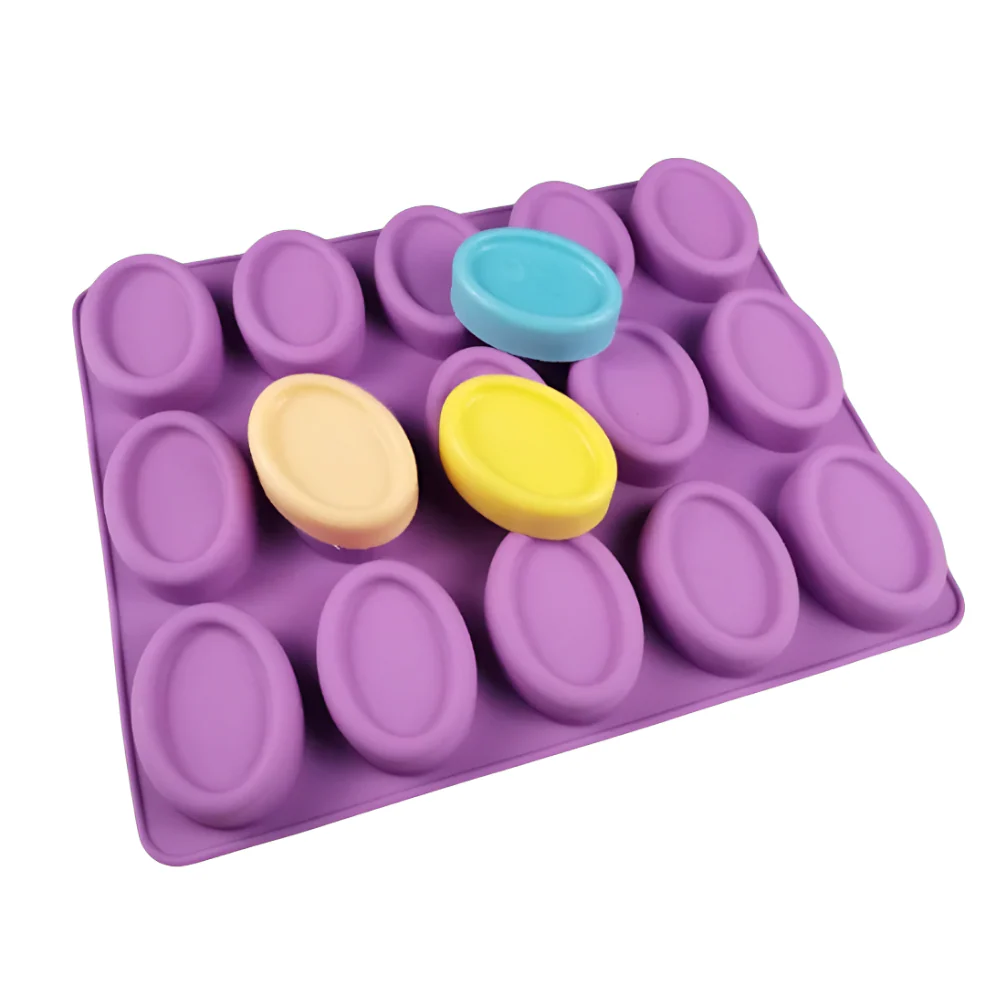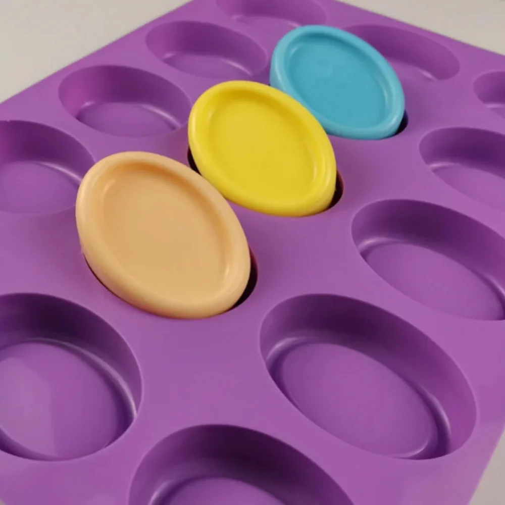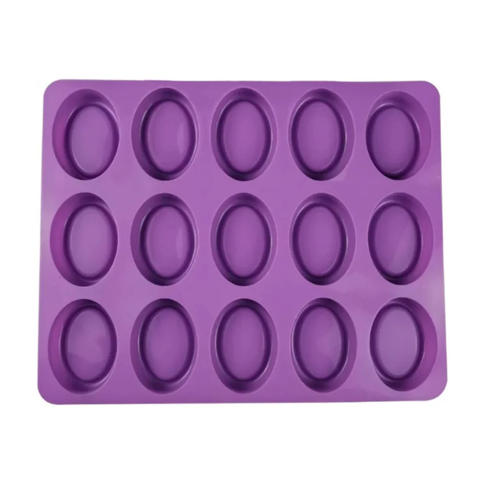 Molde de silicón con 15 cavidades para fabricar jabones ovalados.