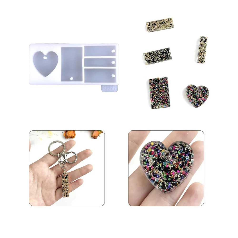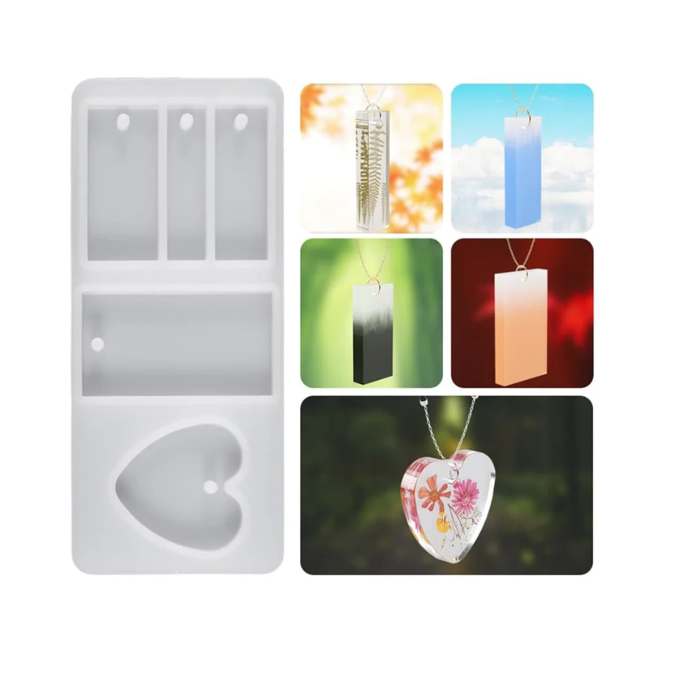 Molde de silicón para resina epoxica. Este molde está fabricado en materiales de alta calidad, por lo cual será el aliado perfecto para tus creaciones y decoraciones. Cuenta con 5 diseños diferentes: 1 corazón y 4 rectángulos de diversas dimensiones, los cuales te aportarán variedad en la fabricación de collares o regalos.