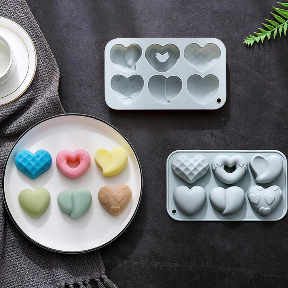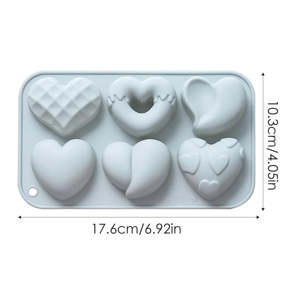 Molde de silicón flexible con 6 corazones dulces, ideales para crear figuras detalladas de forma fácil y rápida.