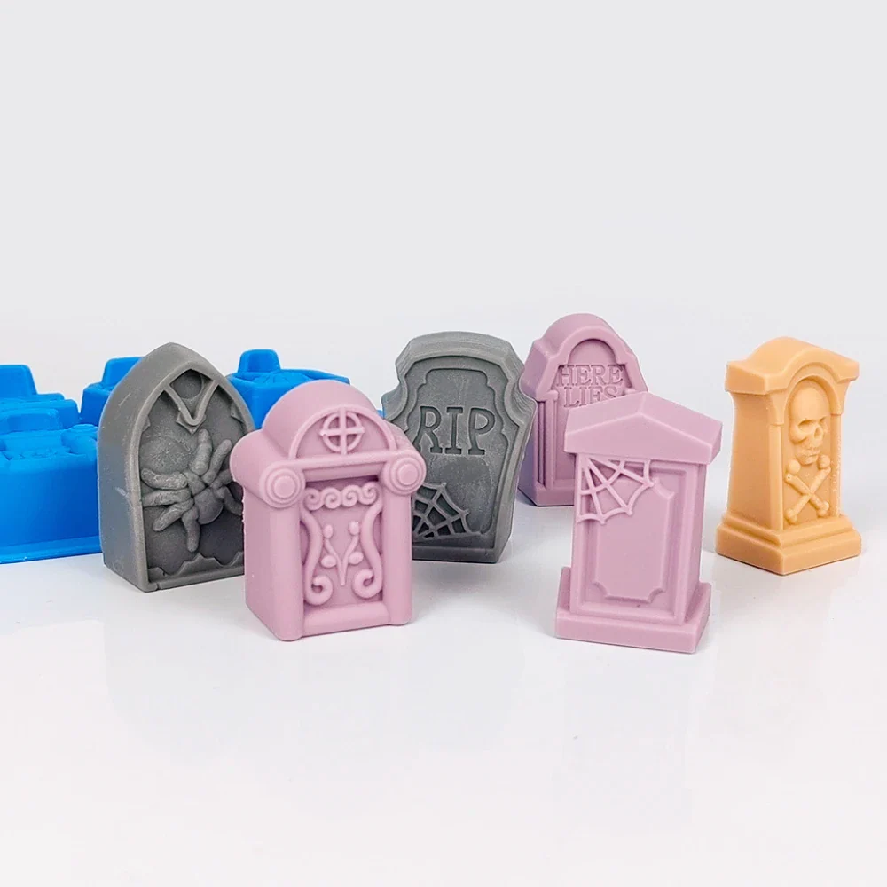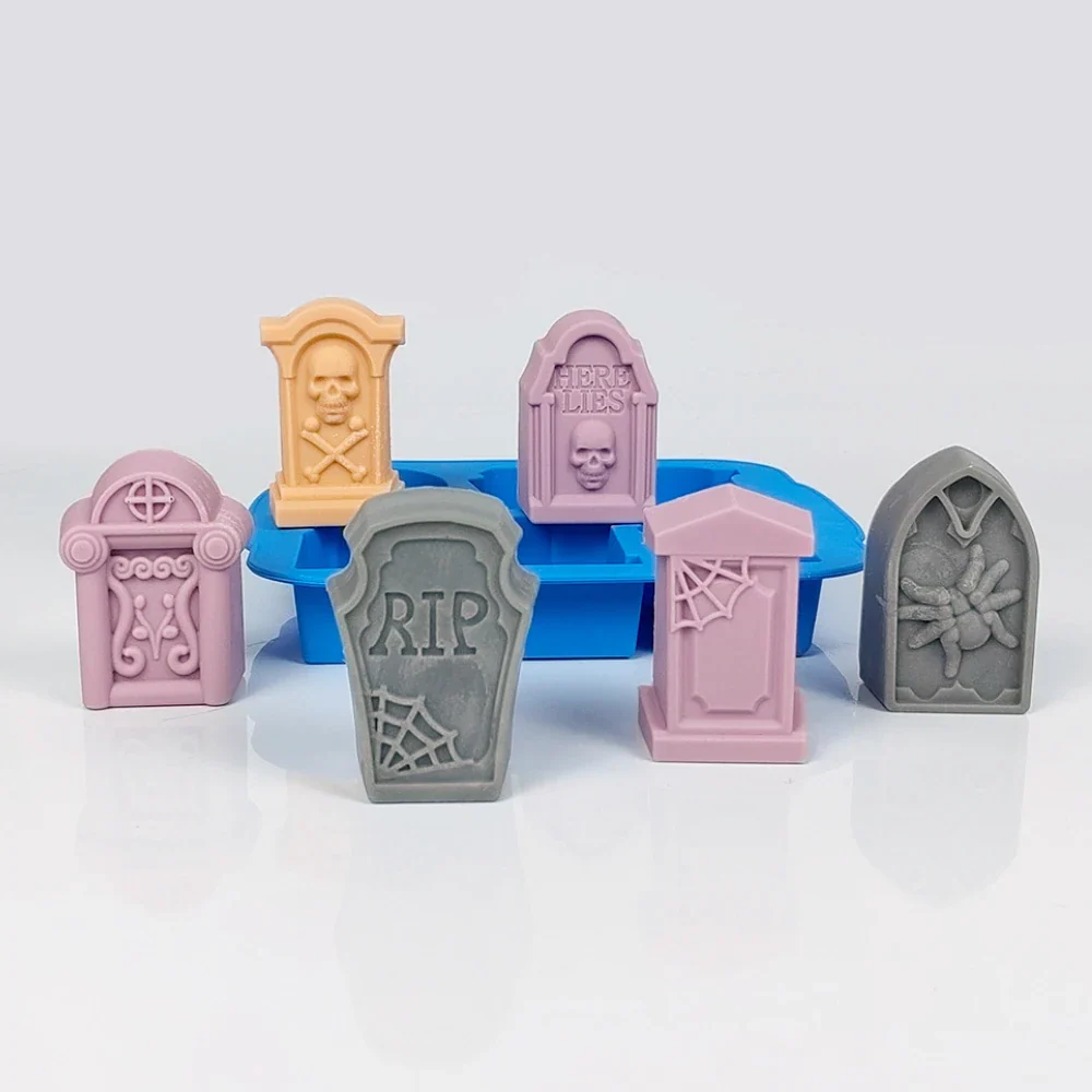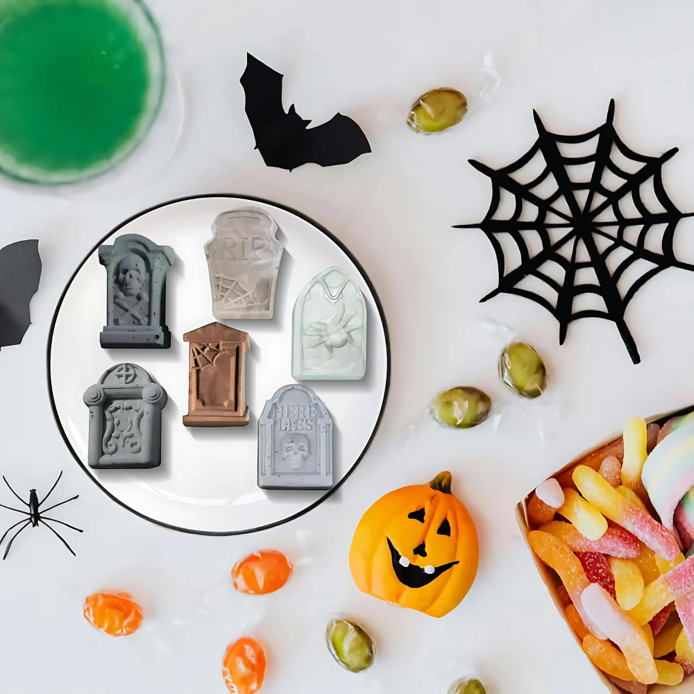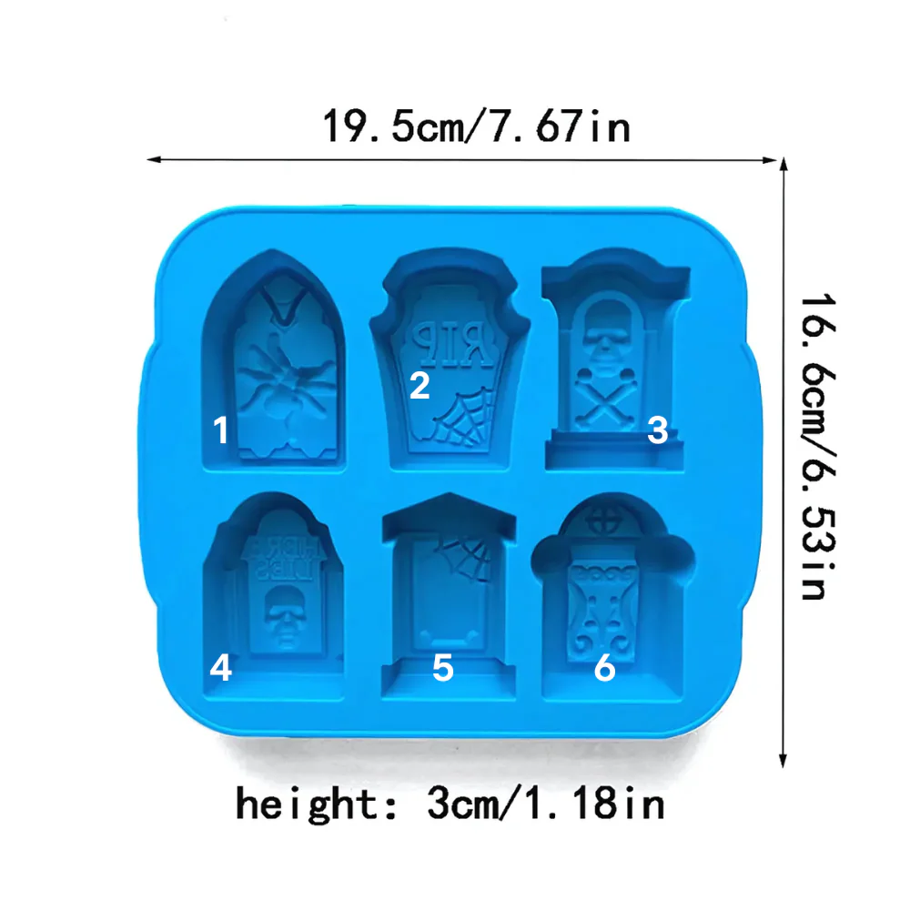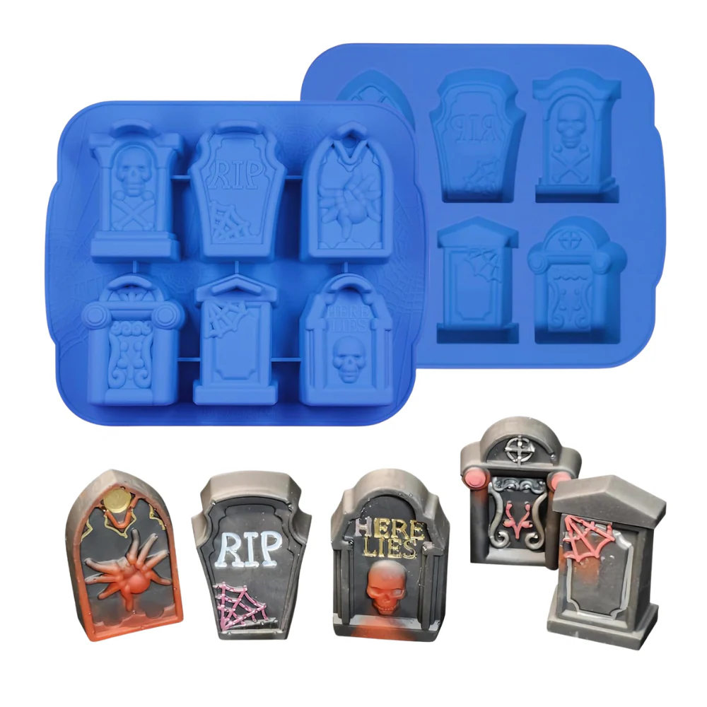Molde de silicón para repostería con 6 tumbas diferentes. Molde perfecto para realizar hielos, cupcakes, gomitas o chocolates, para esta temporada de espanto.