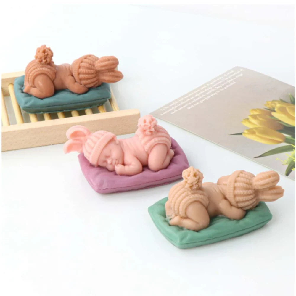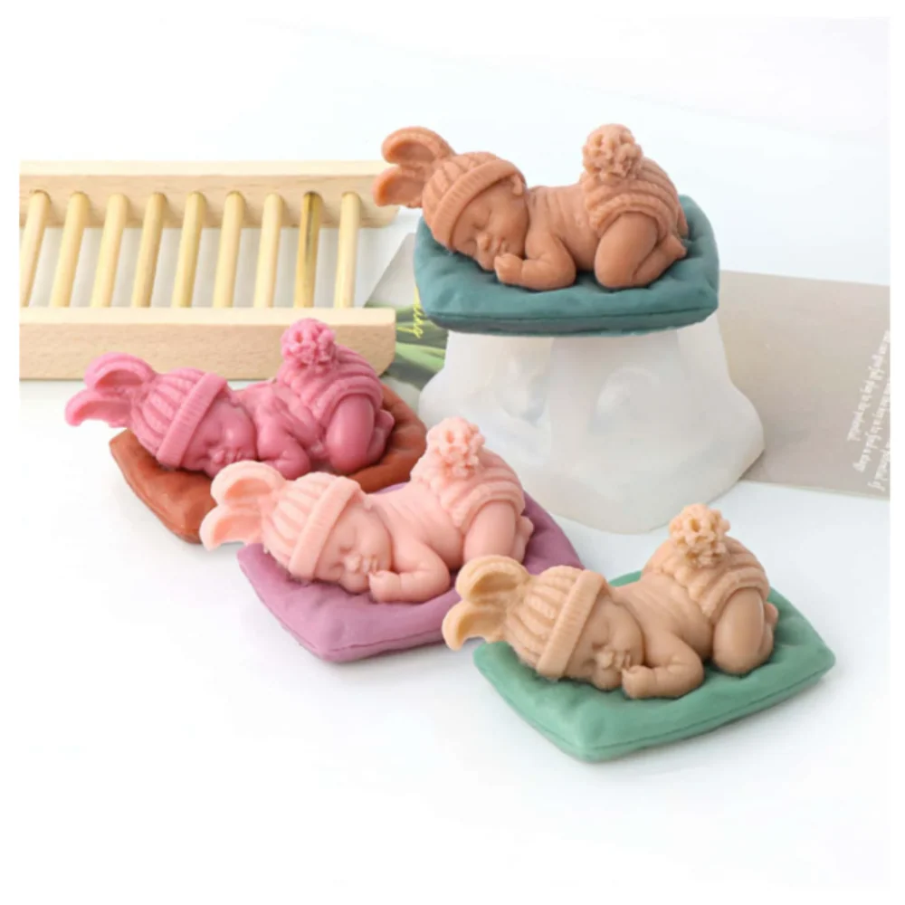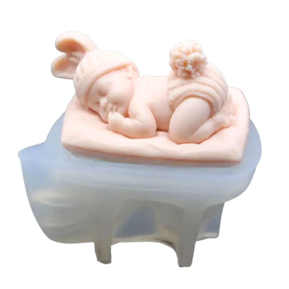 Molde de silicona para elaborar velas, resina, jabon, y más en forma de un bebé dormido con gorro.