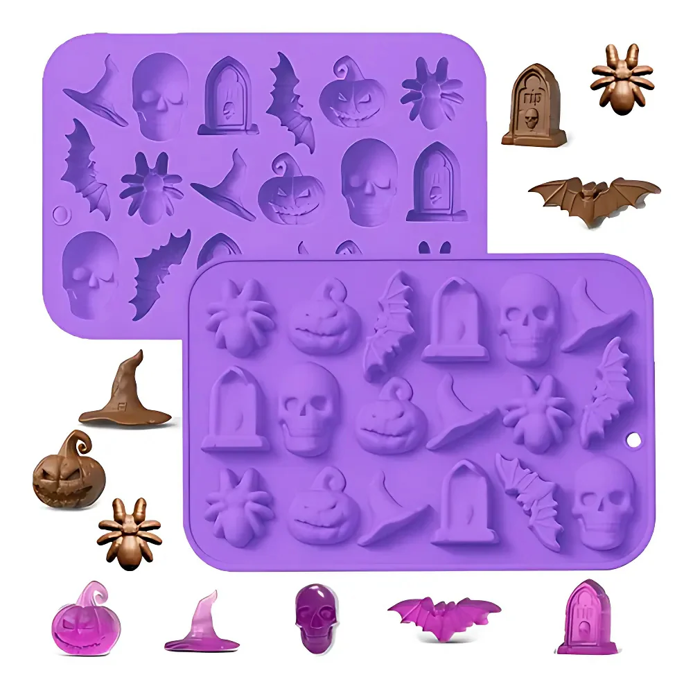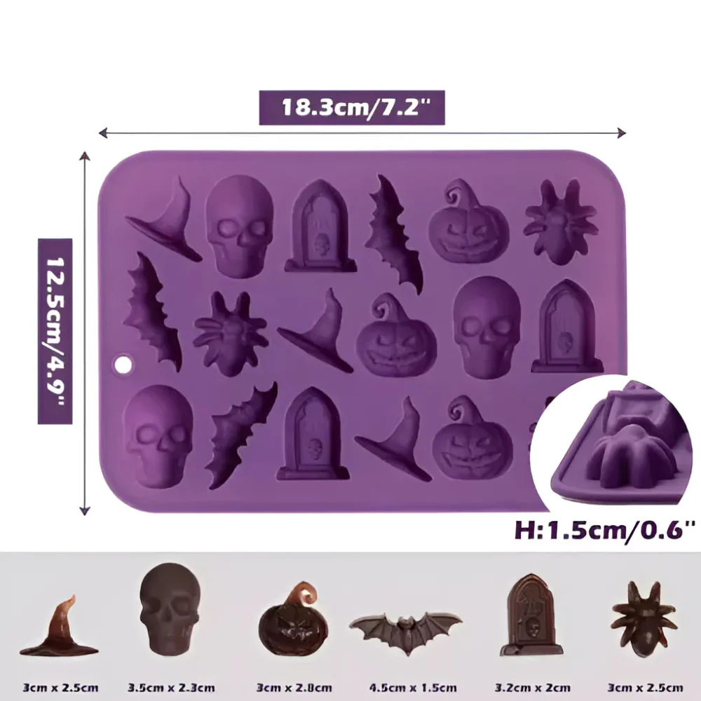 Que el terror se apodere de esta temporada de tus dulces y pasteles. Este molde cuenta con calaveras, lapidas, arañas, murciélagos y sombreros de bruja.