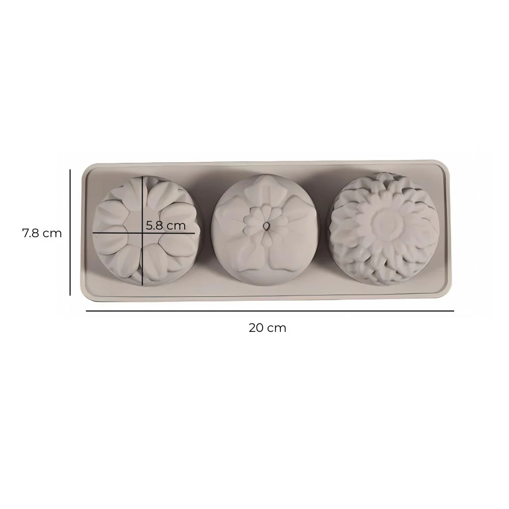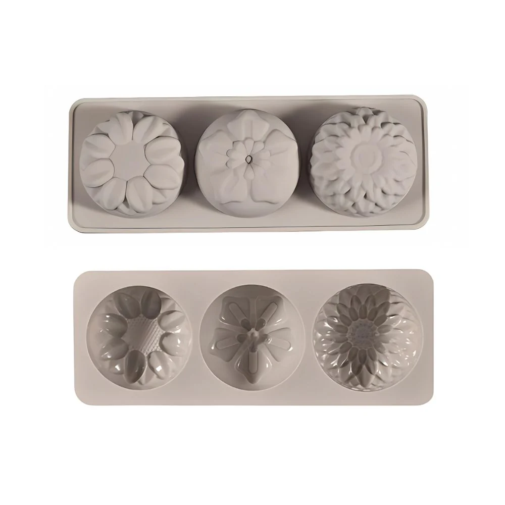 Molde de silicón con 3 cavidades en forma de flor. Este molde tiene 3 diseños diferentes de flor para que tus jabones tengan variedad. Gracias a su resistencia a temperatura -40 A 230 ºC, y su antiadherencia, el desmolde de tus jabones será sencillo. Al estar fabricado en silicón de grado alimenticio, con este molde también podrás realizar pequeñas gelatinas, chocolates, velas o figuras en yeso.