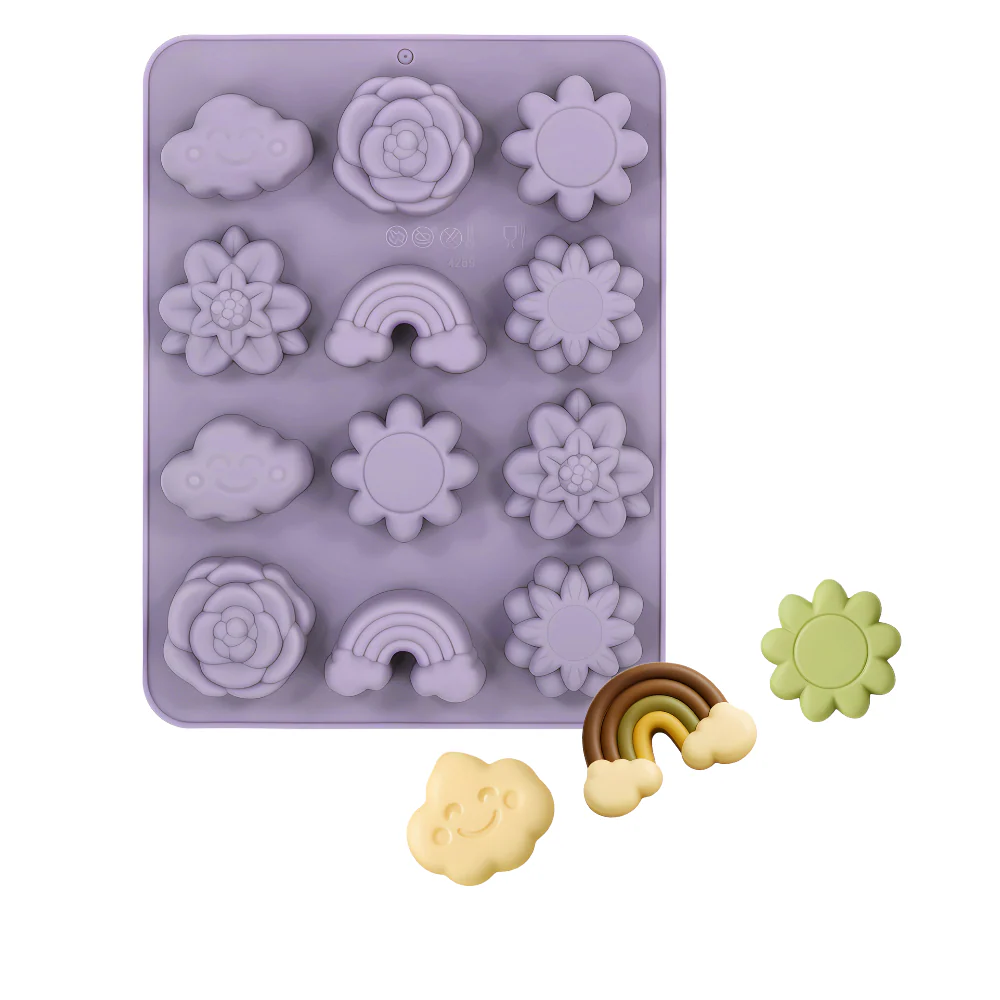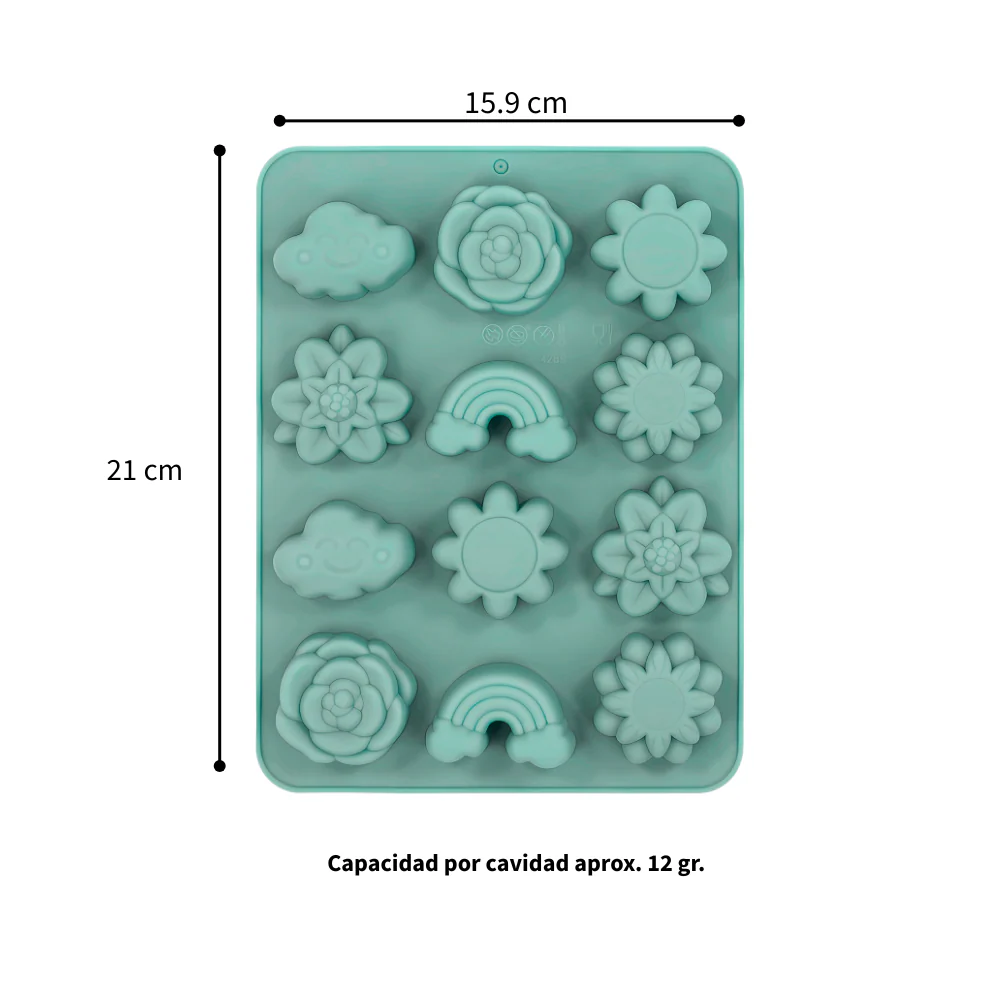 Molde de silicón con 12 cavidades primaverales. Este molde cuenta con figuras super tiernas como lo son arcoíris, nubes y flores.