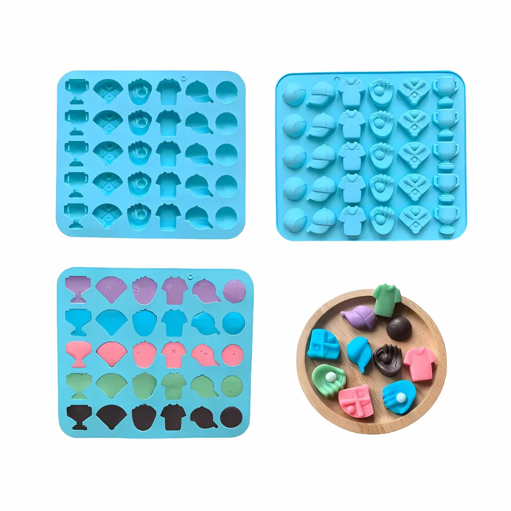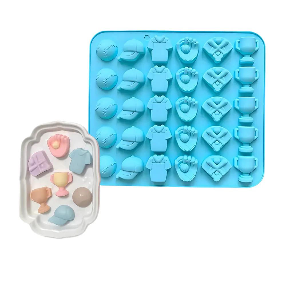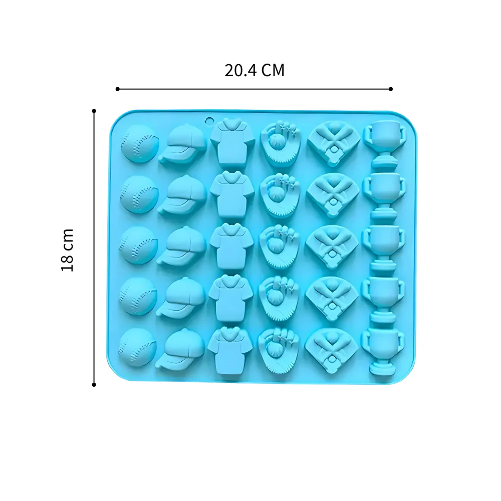 Molde fabricado en silicón de alta calidad y grado alimenticio. Con 30 cavidades de 6 figuras diferentes relacionadas con el béisbol.