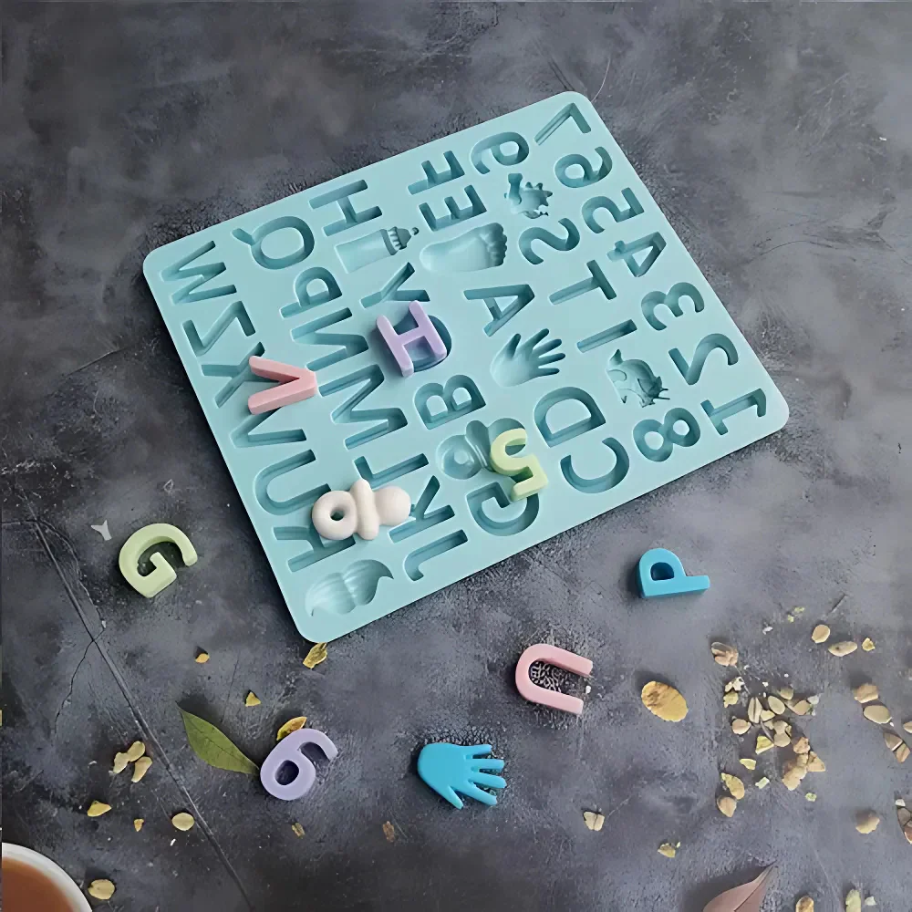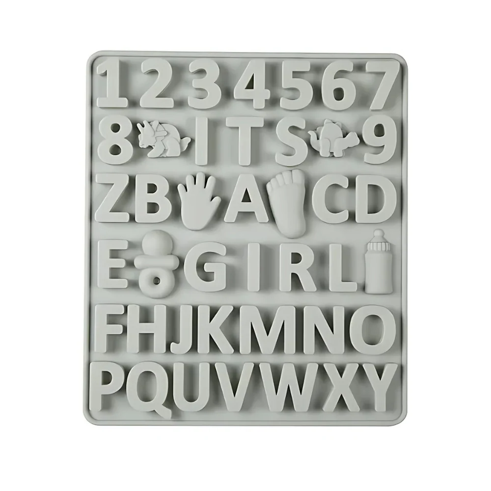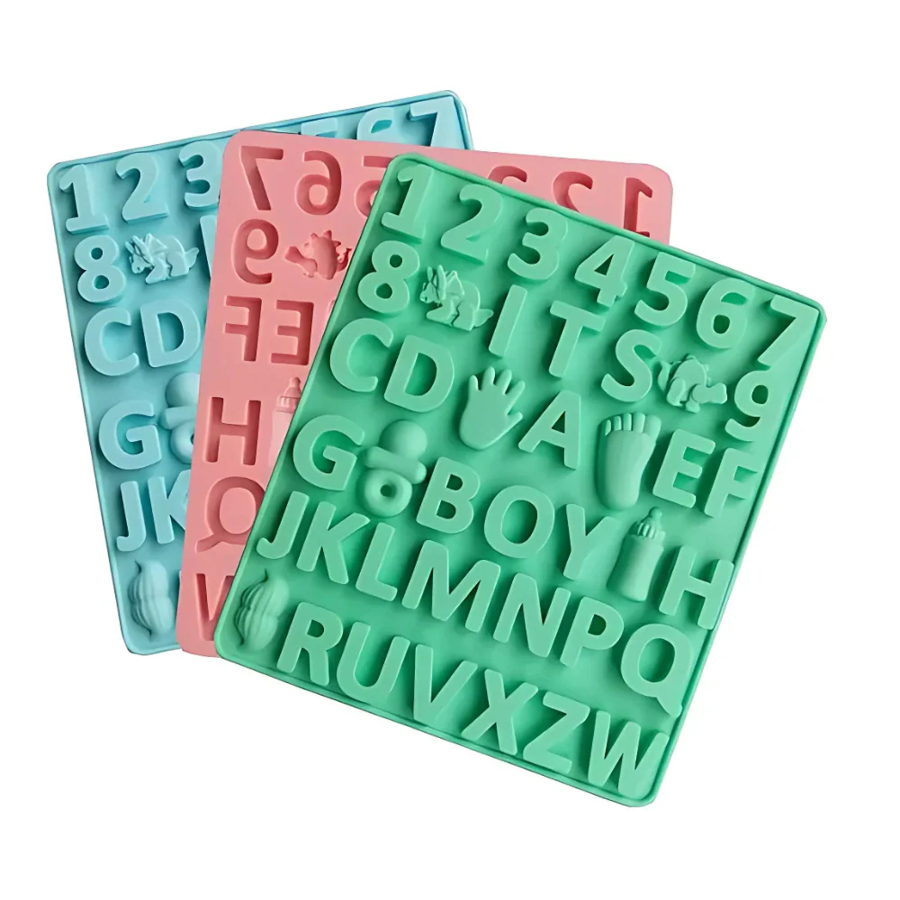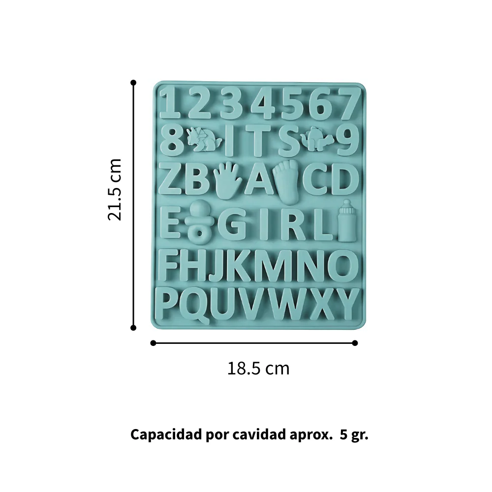 Molde de silicón para gomitas, dulces o chocolates para decoraciones de Baby Shower. Este molde cuanta con letras y figuritas.