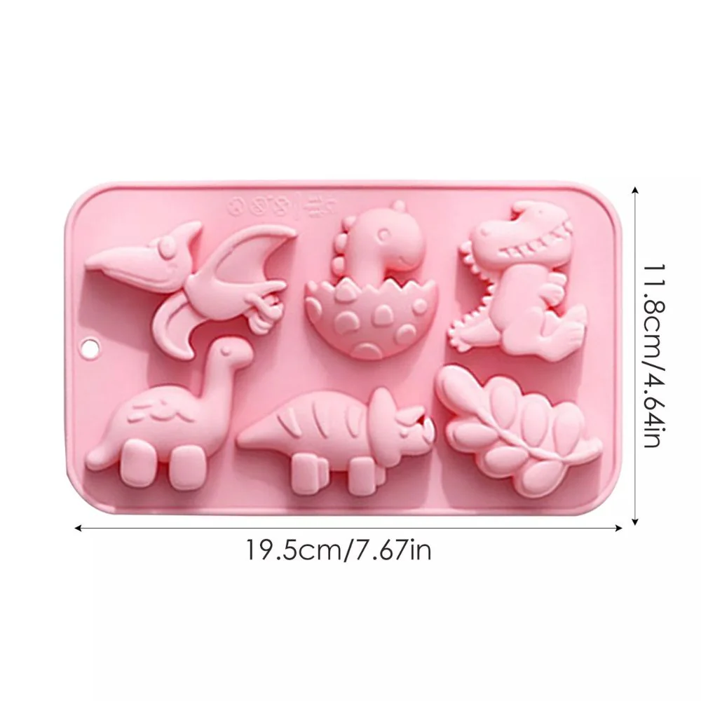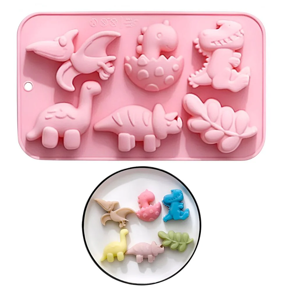 Molde de silicón flexible con 6 cavidades para crear figuras de dinosaurios en estilo caricatura, ideal para personalizar cupcakes, galletas, chocolates y más.