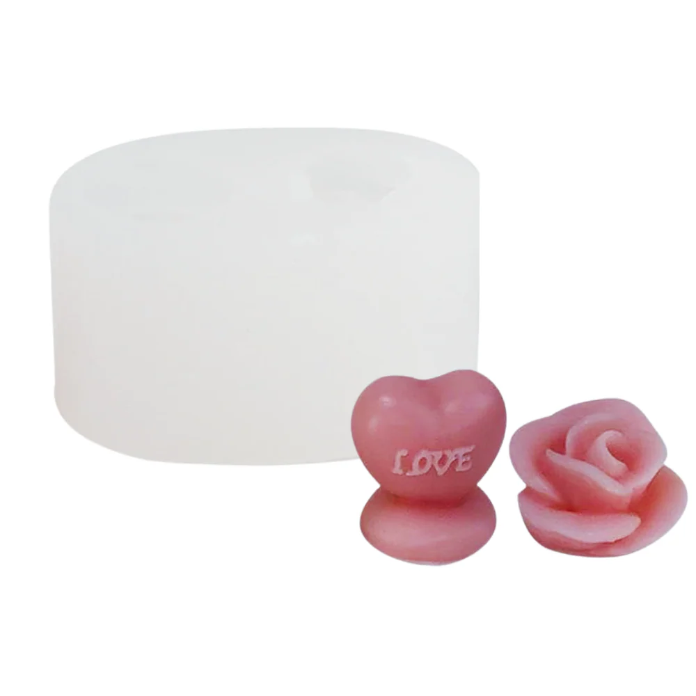 Molde con un botón de rosa y un corazón con palabra love.