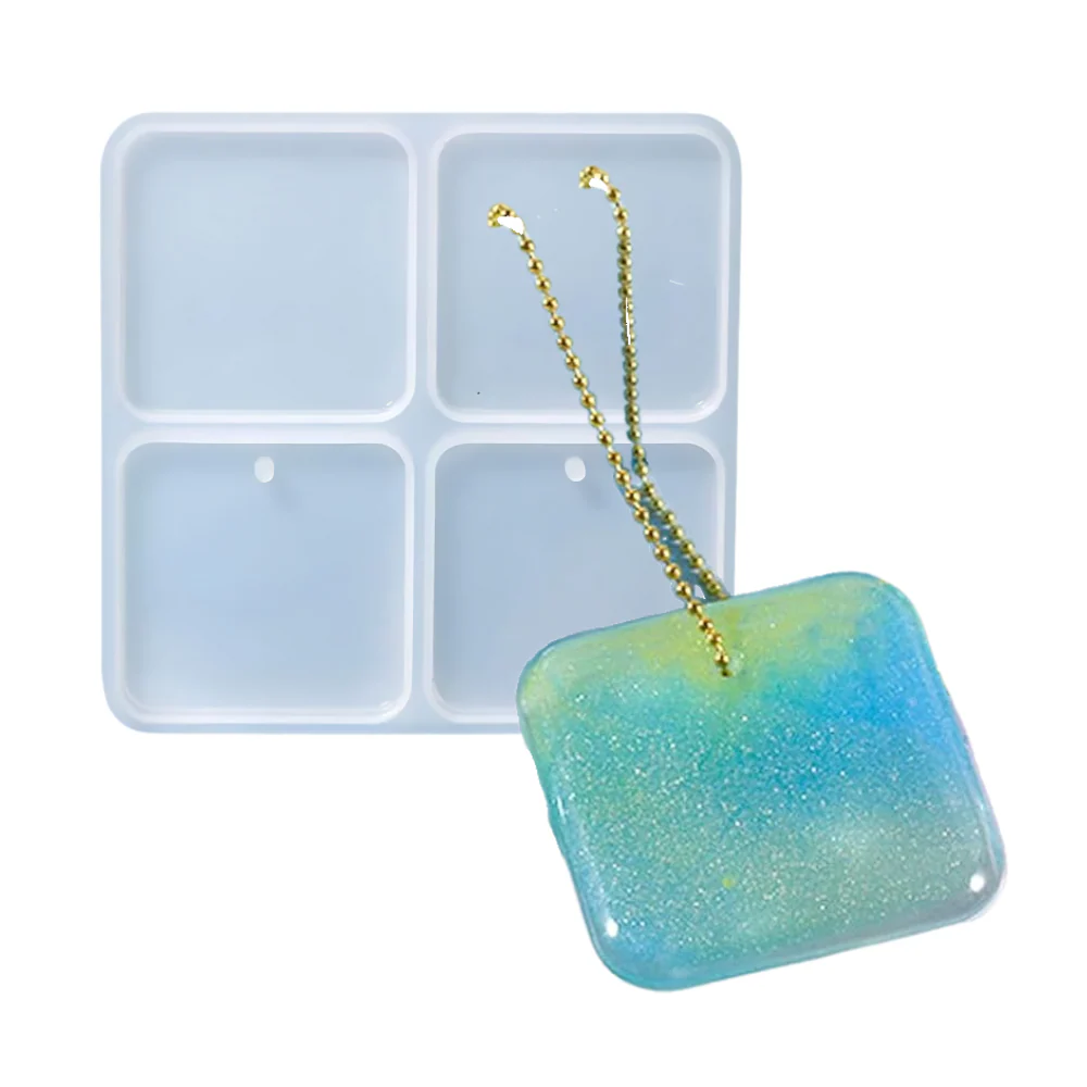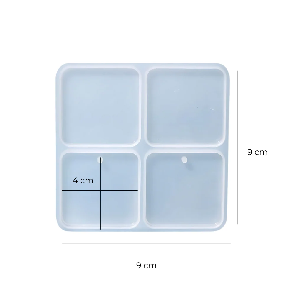 El molde que no puede faltar, ya que resalta la sencillez y belleza. Molde de cuadro para dijes que miden 4 cm. Dos cavidades completamente lisas y dos con un pequeño agujero para colgar.