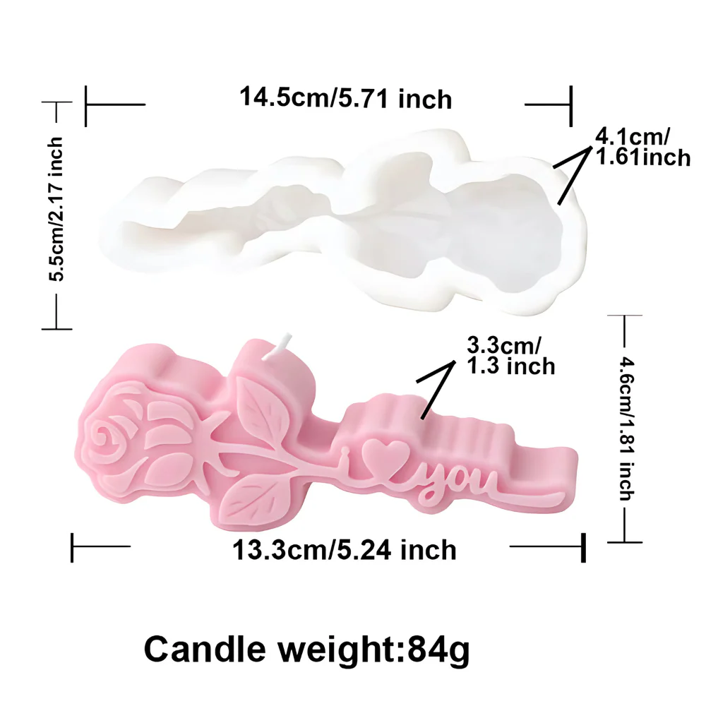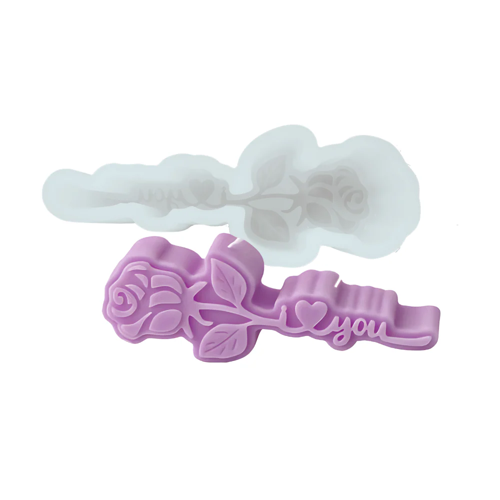 Molde de silicón en forma de rosa vintage y tallo con forma de I <3 YOU en cursiva.