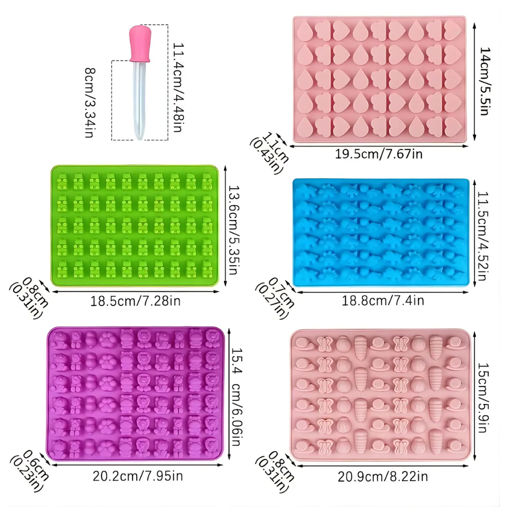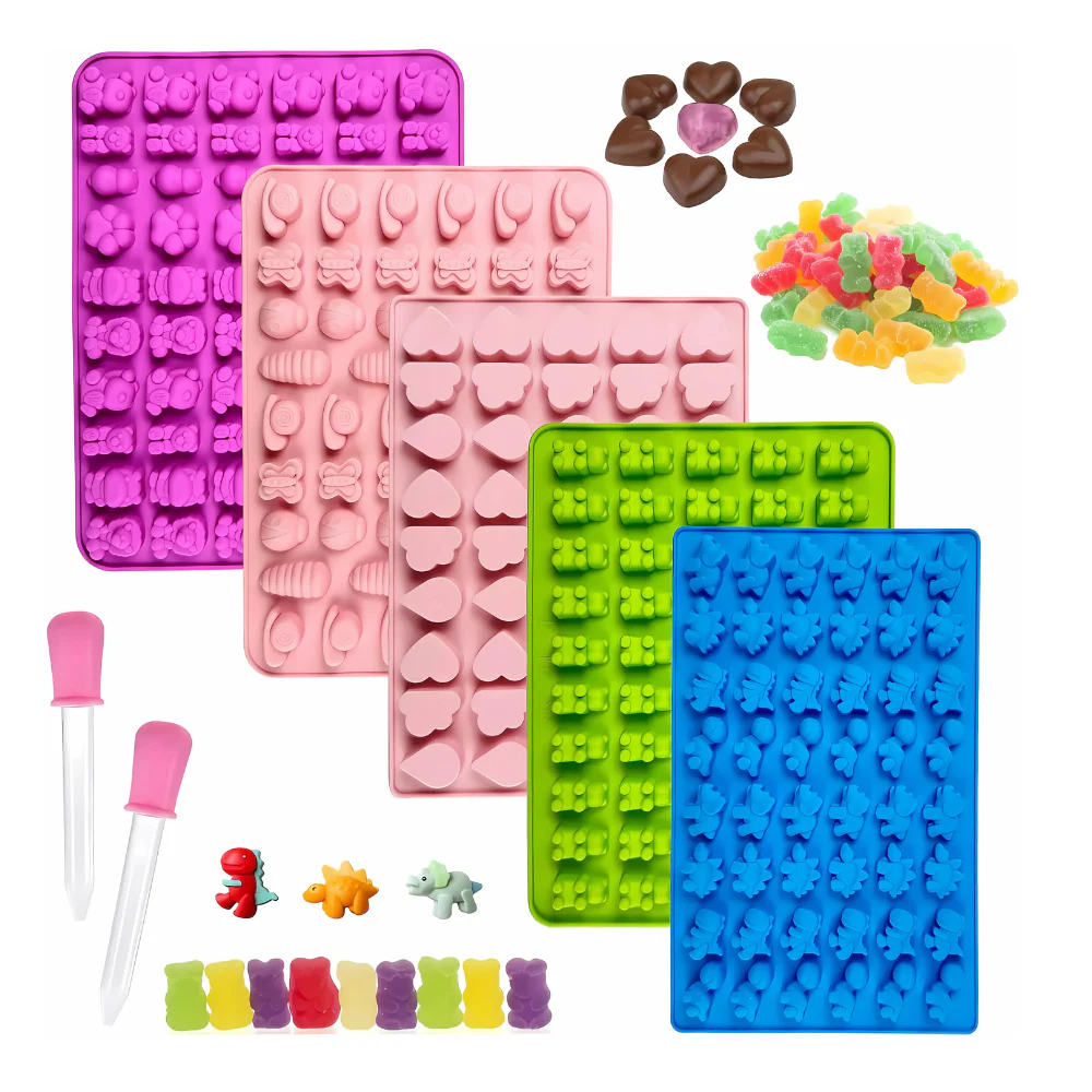 Este kit para realizar gomitas cuenta con 5 moldes de silicón flexible y libre de BPA y dos goteros.