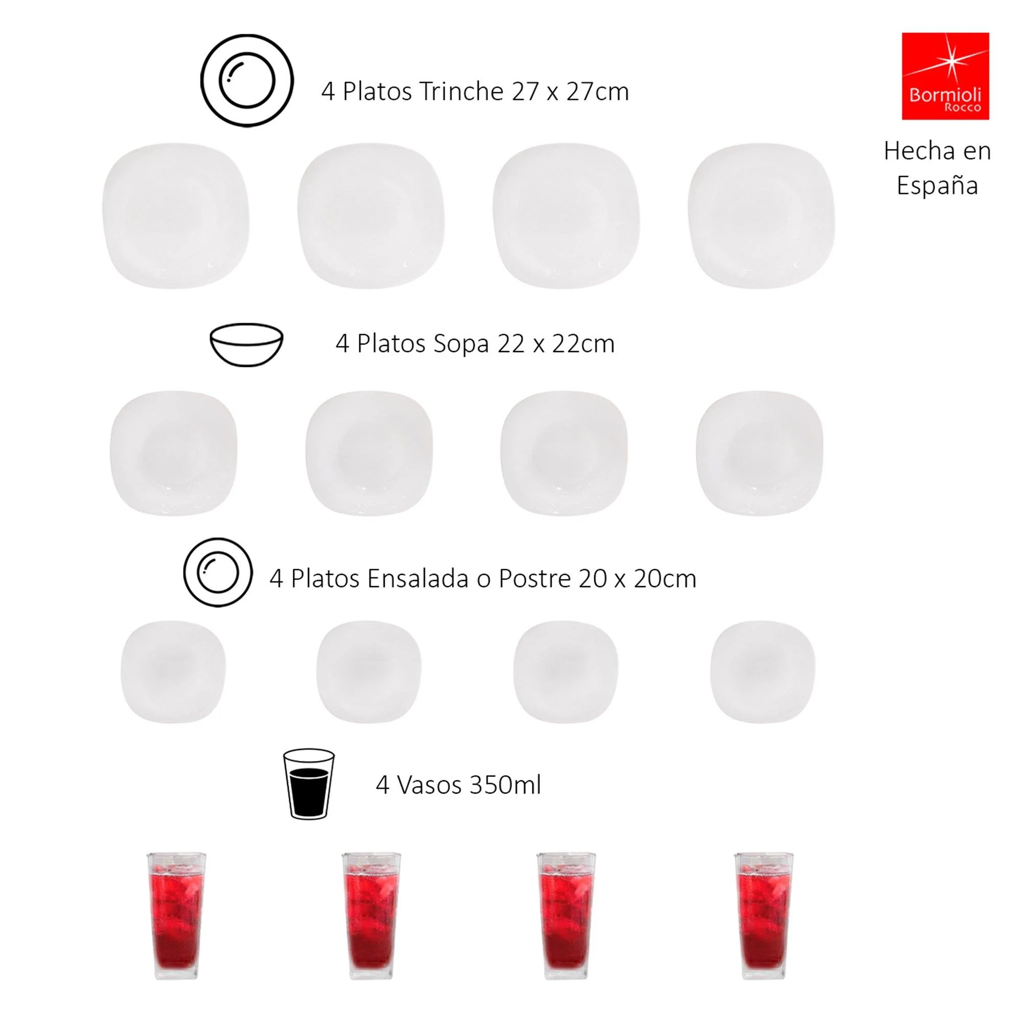 - COMPOSICIÓN DE LA VAJILLA: 16 piezas compuestas por 4 platos planos trinche o base, 4 platos pequeños o platos de postre/ ensalada, 4 tazones y 4 vasos de vidrio